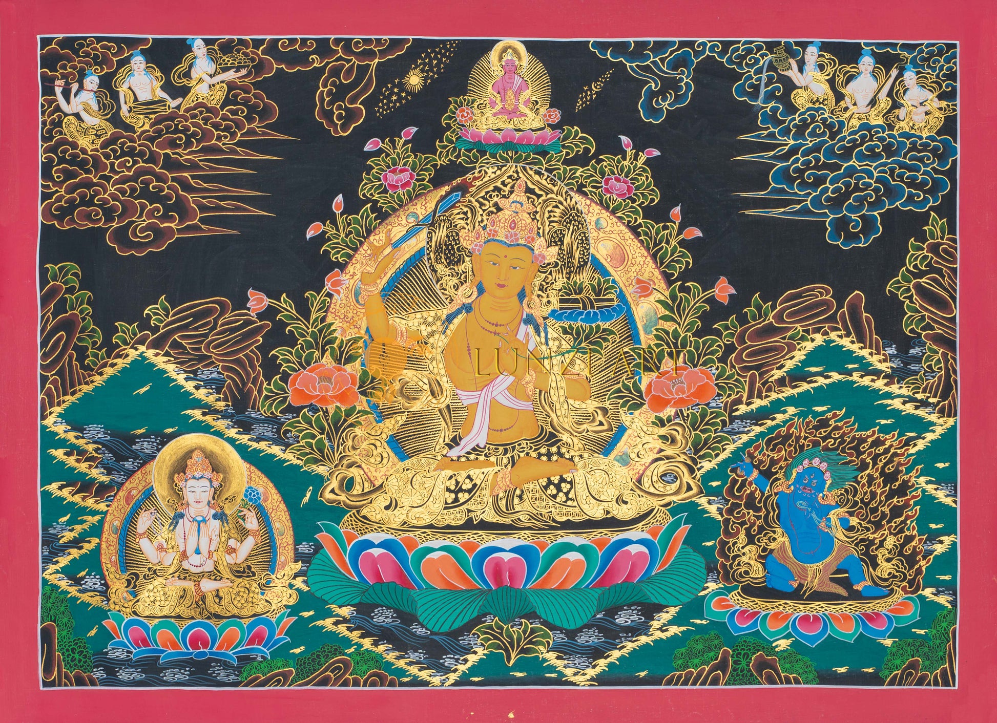 At the centre is the Bodhisattva Manjushree, symbolic of enlightened wisdom, seated elegantly on a lotus throne. With his right hand, he carries the flaming sword of wisdom, cutting through the darkness of ignorance, and in his left, he supports the Prajnaparamita Sutra, the perfect wisdom scripture. His calm face and golden body emanate an aura of profound stillness and mental acuity. Surrounded by meditating deities and sacred themes, the thangka is a spiritual roadmap to the pilgrimage of a seeker.