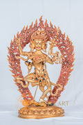 The statue’s face expression is fierce, bared fangs, bulging eyes represent the power and intensity of compassion and wisdom and stands in a dynamic posture encircled by flames of wisdom, symbolizing the transformation of ignorance into enlightenment. She holds a vajra-handled blade and skull cup, signifying the severance of attachments and the realization of ultimate truth.