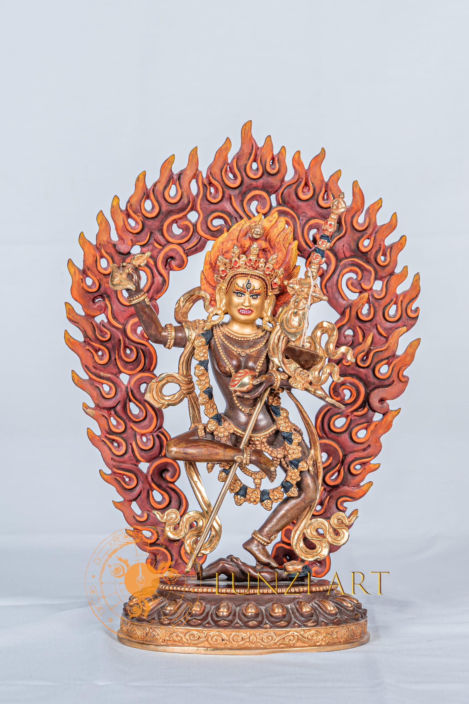 The statue stands in a dynamic, dancing pose on a lotus base. The statue has a wrathful expression with three wide, bulging eyes and bared fangs. It’s hair flows upwards like flames. Its primary right hand holds a curved knife (Kartika) representing the inseparable union of wisdom, while the left hand holds a skull cup (Kapala). The figure is adorned with a skull crown and other ornaments, embodying a wrathful deity in a powerful posture.