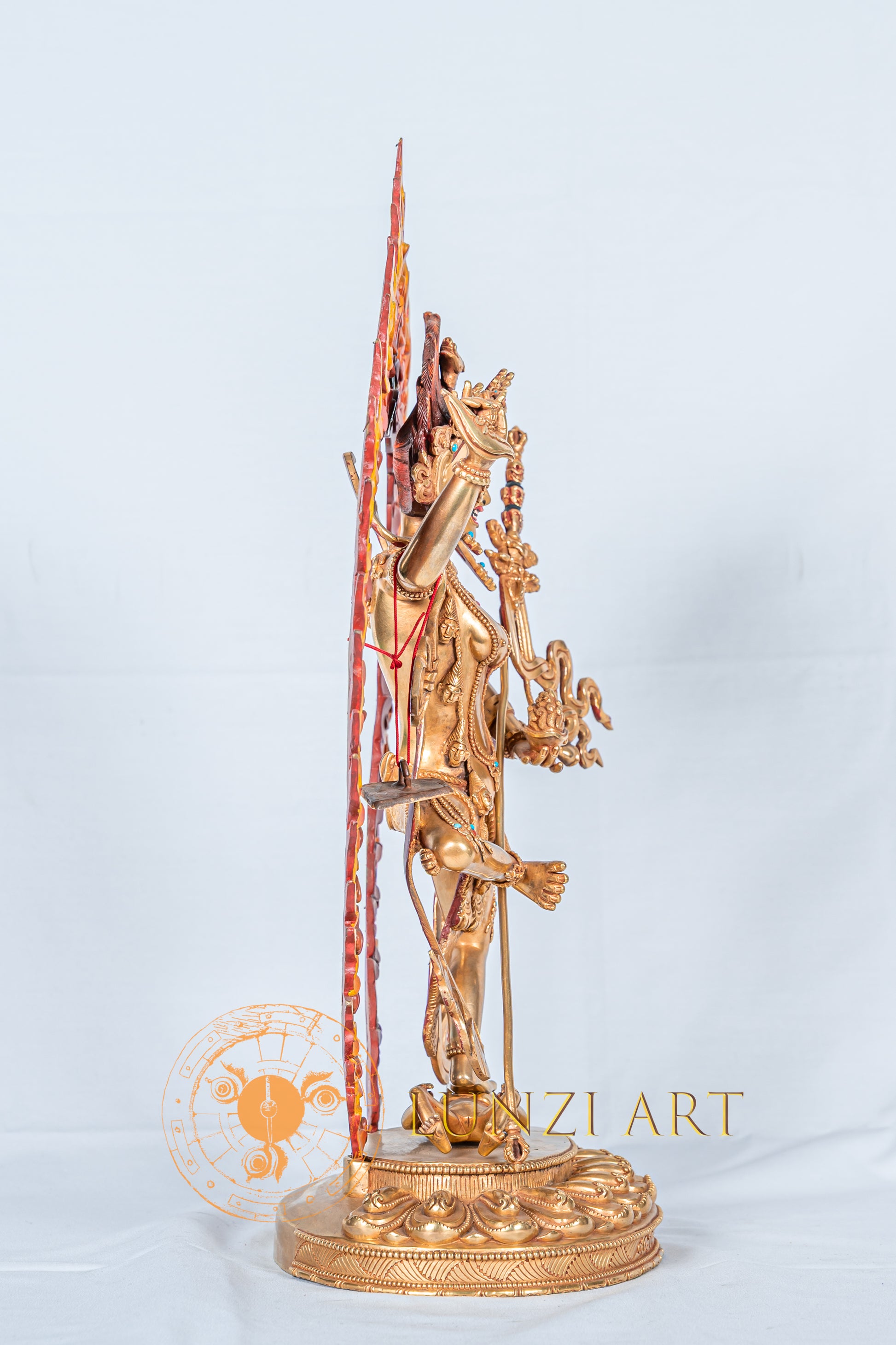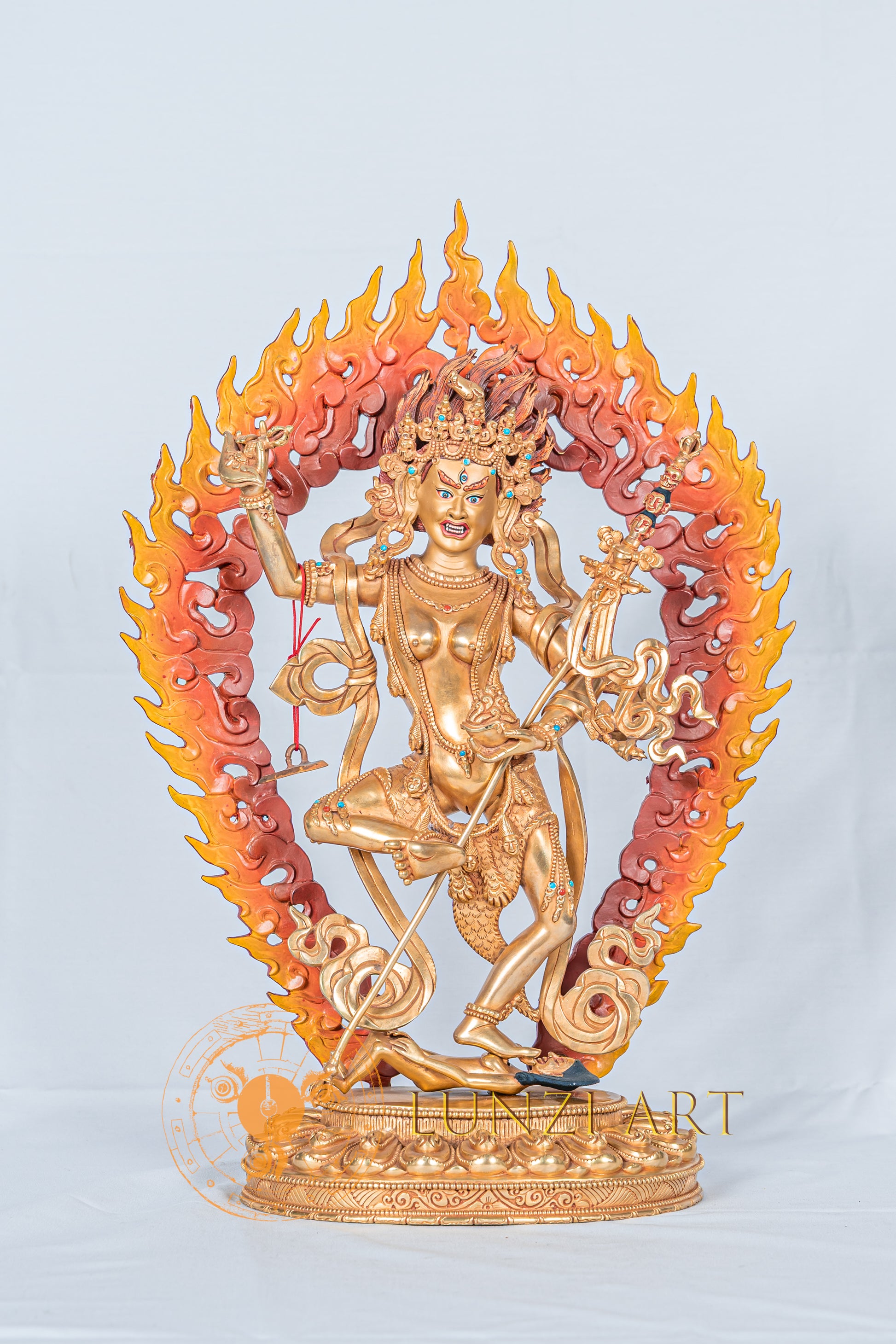 This statue of Vajra Varahi is made by skilled craftsmen working with Lunzi Art. The entire statue is crafted from a copper and fully plated with 24K gold using the ancient lost wax casting method, and then the intricate patterns were hand-carved and polished.