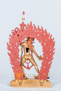 The statue’s face expression is wrathful, with a wide, open mouth. Her hair is intricately detailed and adorned with a crown of human skulls. A delicate necklace of human skulls hangs around her neck, signifying her triumph over death and ego. The statue holds a vajra-handled curved knife (Kartika) in her right hand. In her left hand, she holds a skullcup (Kapala) filled with blood, representing the transformation of delusion and negativity into the nectar of wisdom. A ritual staff (khatvanga) rests in the crook of her left arm, which symbolizes the wisdom. Behind Vajra Yogini is a brilliant, blazing aura of wisdom fire.