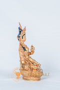 The statue of White Tara radiates a serene aura of compassion and divine grace, her face delicately hand-painted to reflect wisdom, purity, and tranquility. Seated in the lotus posture upon a finely detailed double-lotus pedestal. Her right-hand rests upon her knee in the varada mudra, symbolizing generosity and compassion, while her left hand, raised in the vitarka mudra, holds the stem of a blossoming utpala lotus that blooms beside her shoulders, representing purity and enlightenment. Adorned with an ornate five-leaf crown inlaid with turquoise and coral, intricate jewelry, and flowing celestial garments, her fully gold-plated copper body shimmers with divine radiance.