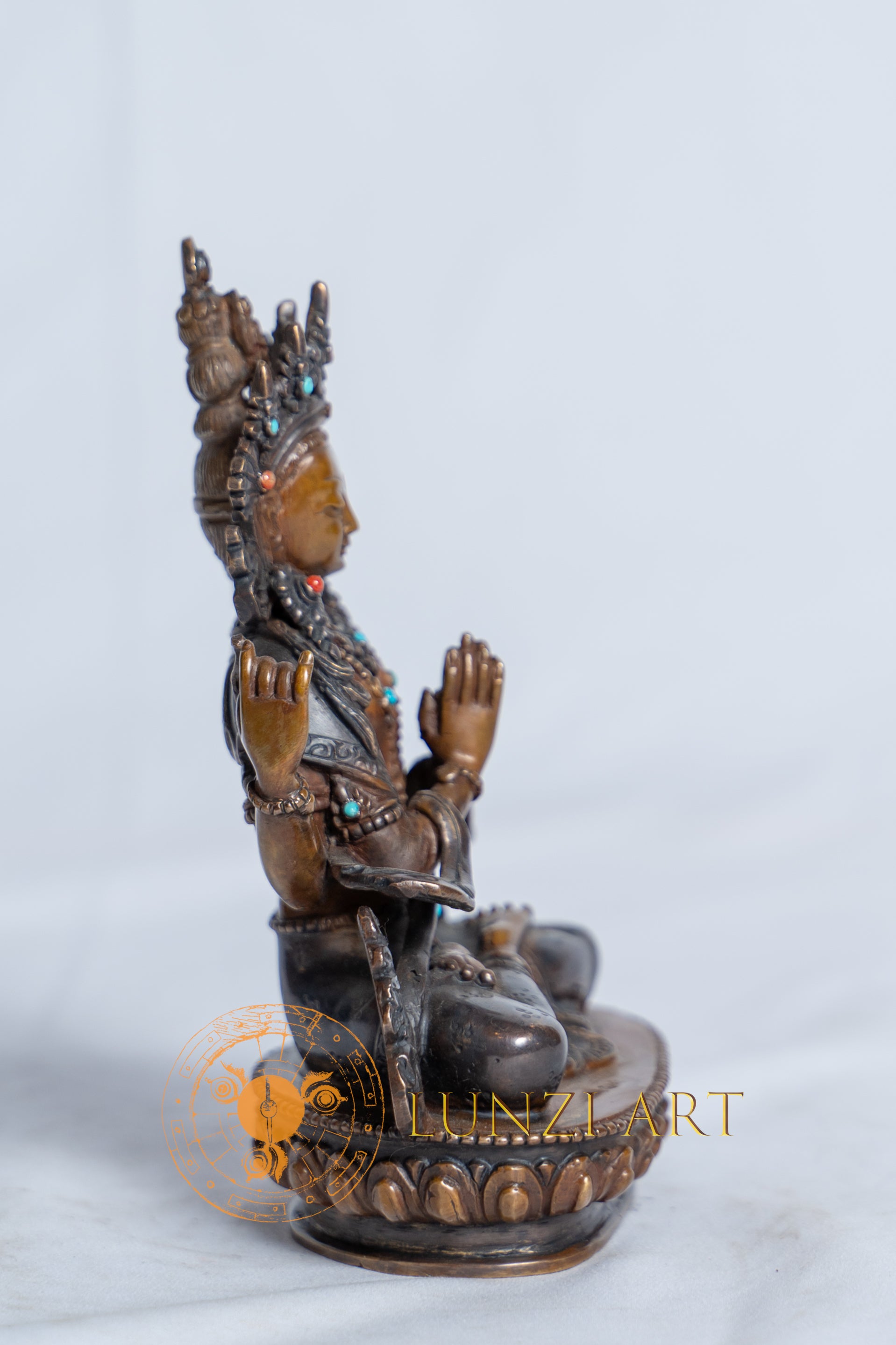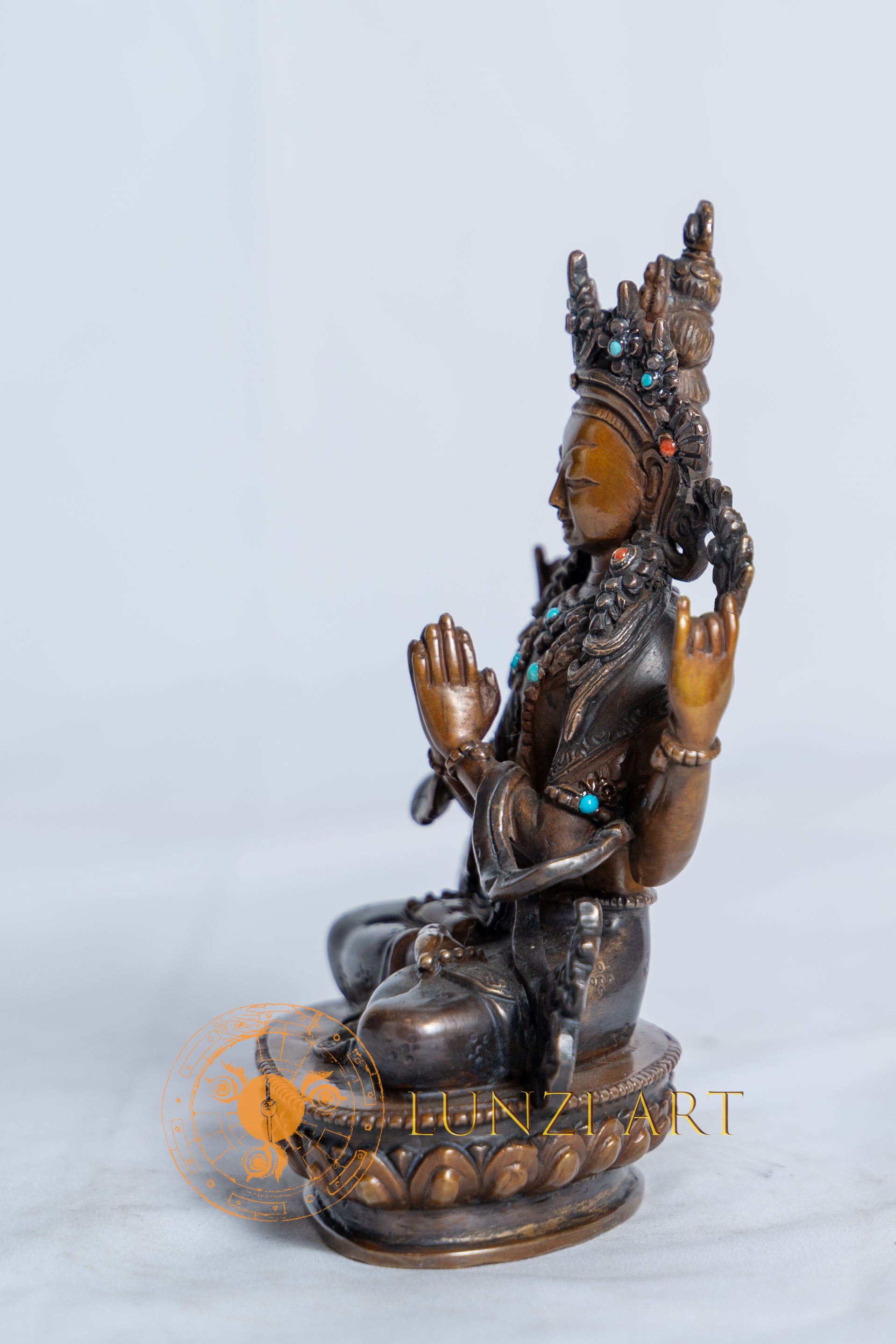 This four-armed seated Chenrezig is handcrafted by skilled craftsmen working with Lunzi Art. The statue is made of high-quality copper. It is then carefully hand-carved with intricate patterns, polished to a dazzling sheen.