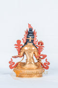 The statue of White Tara radiates a gentle yet powerful aura of compassion and serenity, her face delicately hand-painted to convey a serene and enlightened expression. Seated gracefully in the lotus posture, her right hand is extended in the gesture of supreme generosity, while her left hand holds the stem of a blooming lotus, symbolizing purity and spiritual awakening. Adorned with an intricate lotus crown, flowing celestial robes, and finely detailed jewelry, the fully gold-plated copper body glimmers with divine elegance. Resting upon a beautifully crafted single-lotus pedestal, this exquisite sculpture embodies both sacred beauty and exceptional craftsmanship.