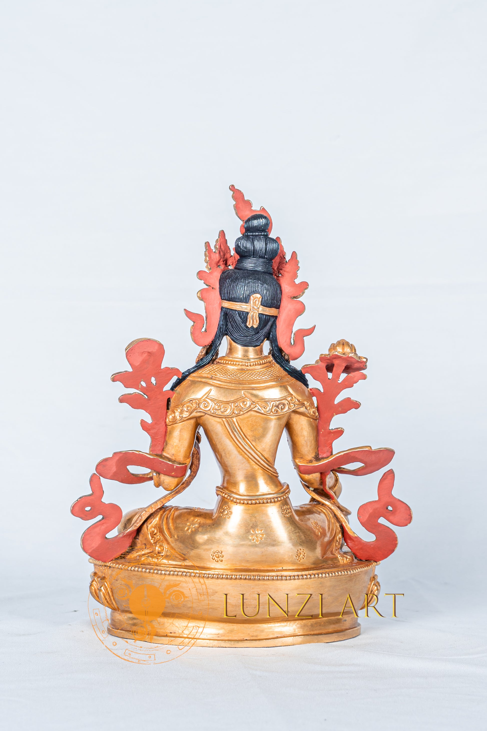 This statue of Green Tara was meticulously handcrafted by skilled craftsmen working with Lunzi Art. Made of fully gold-plated copper, it has been beautifully hand-painted to highlight the intricate details and lifelike expression of the master. Created using the traditional lost-wax casting method and carefully hand-carved with exceptional precision.