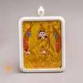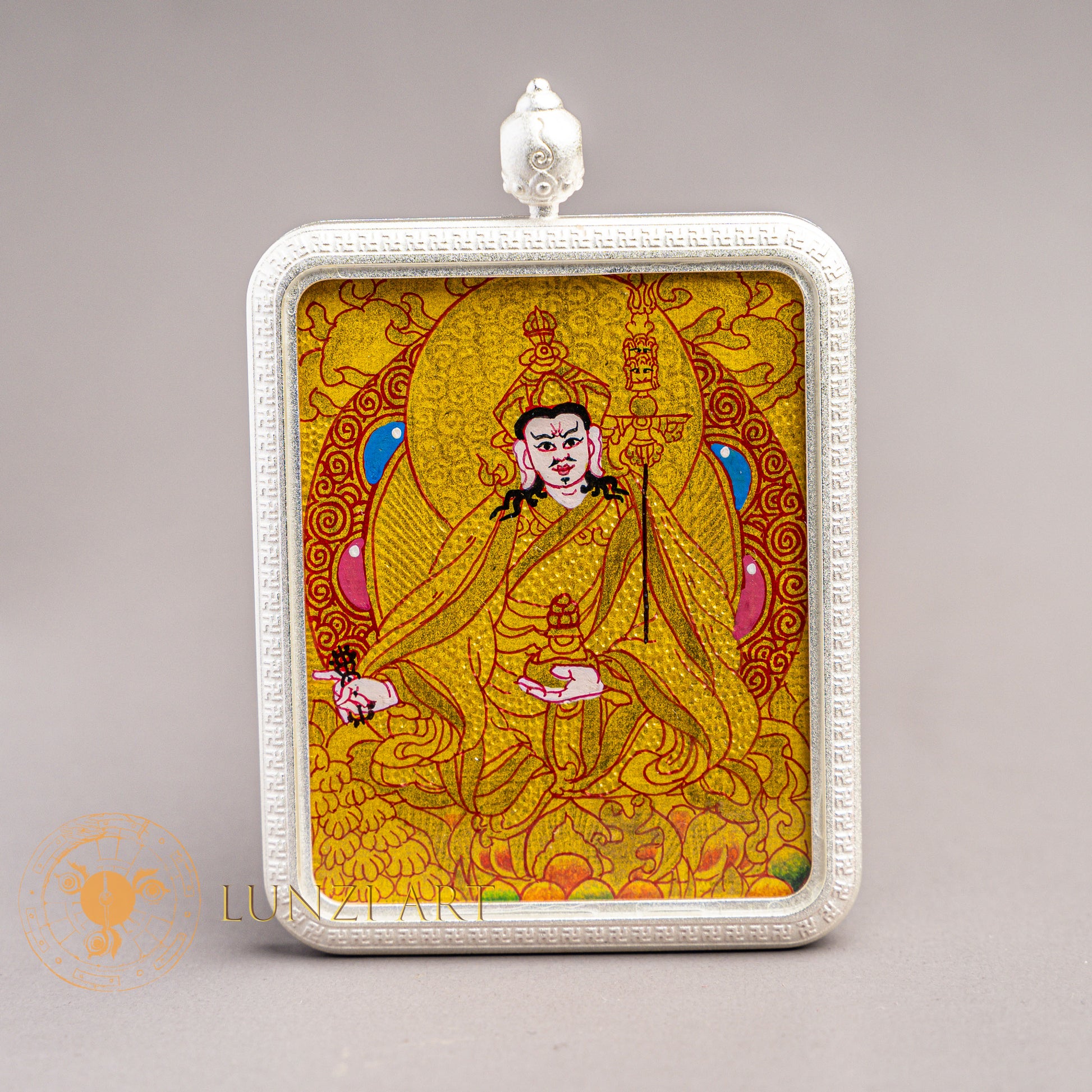 This unique portable shrine features a meticulously detailed, hand-painted miniature Thangka of Guru Rinpoche encased within an ornate metal locket.