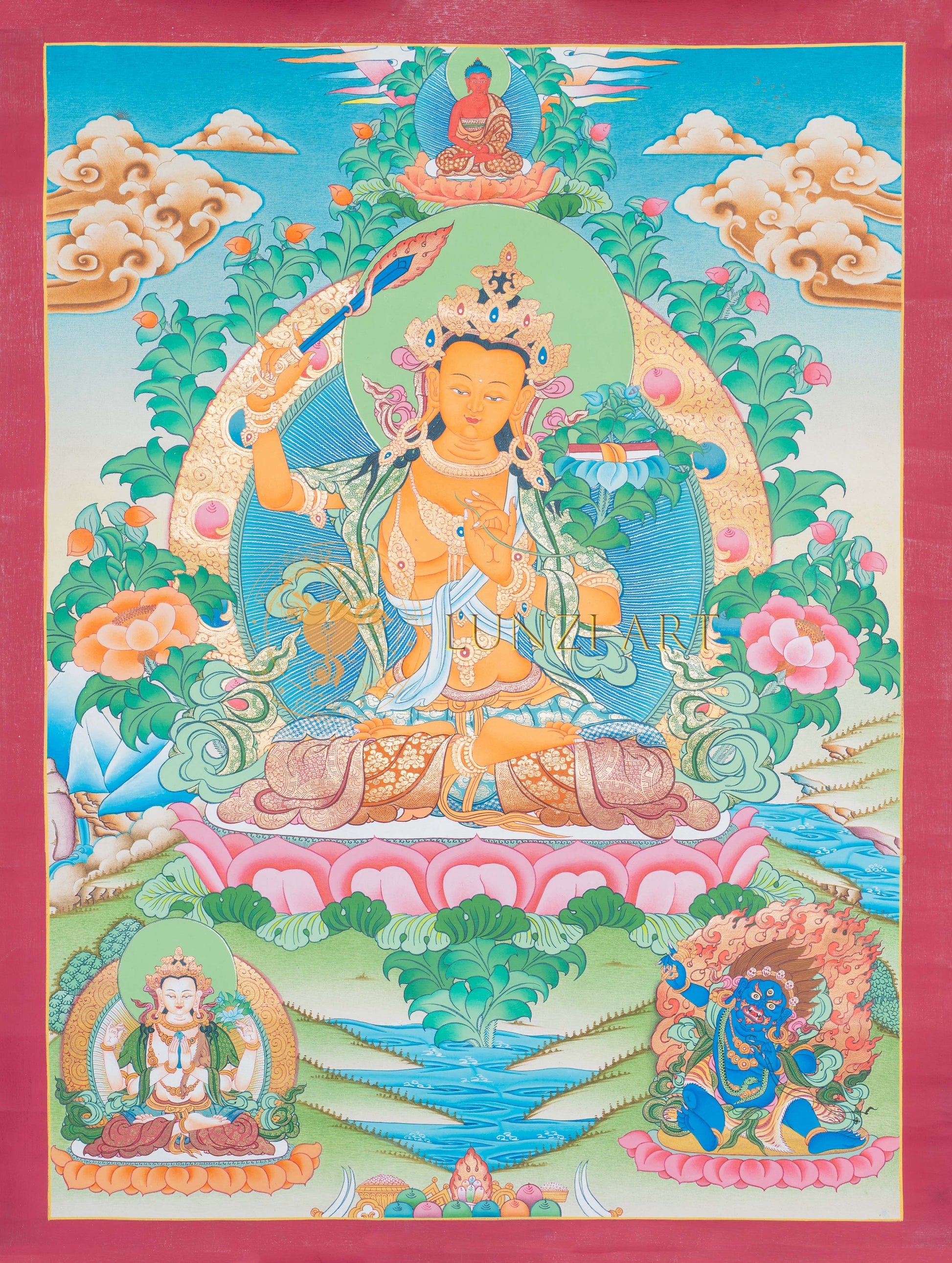 In the depiction of the Bodhisattva Manjushri, the artist gives the figure a sword of fire in his right hand a symbol of cutting through ignorance and all false thoughts. Left hand, held close to the chest, is holding a lotus flower signaling the perfection of wisdom. Avaricious eyes of Avalokiteshvara and evil Vajrapani are there to help eradicating ignorance, combining in this painting the themes of wisdom and love. It is faith and practice at the same time that this holy work of art represents.