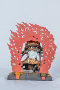 With a fierce and intense facial expression, Vajrapani is depicted in a rage, standing in a ferocious pratyalidha posture. A third eye is carved on his forehead. His legs are spread out, with one foot resting on a demonic figure. His right arm is raised high above his head, clutching a vajra (thunderbolt). His left hand holds a lasso. He wears a furious ornament. Coiled snakes are wrapped around his arms and body. He wears a tiger skin garment draped over his hips. A flaming flame halo surrounds his figure, representing the fire of wisdom.