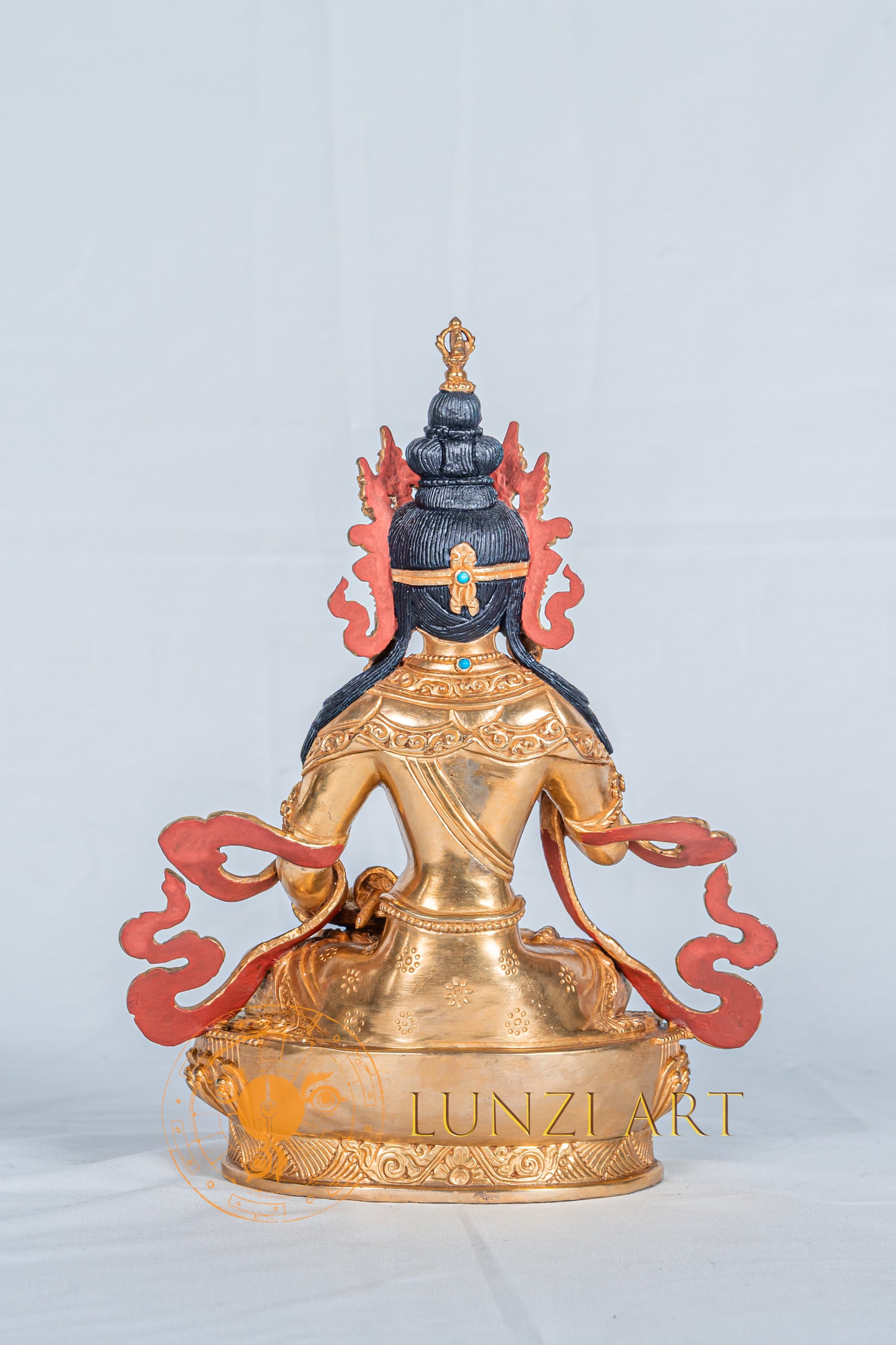 This statue of Vajrasattva was meticulously handcrafted by skilled craftsmen working with Lunzi Art. Made of fully gold-plated copper, it has been beautifully hand-painted to highlight the intricate details and lifelike expression of the master. Created using the traditional lost-wax casting method and carefully hand-carved with exceptional precision.