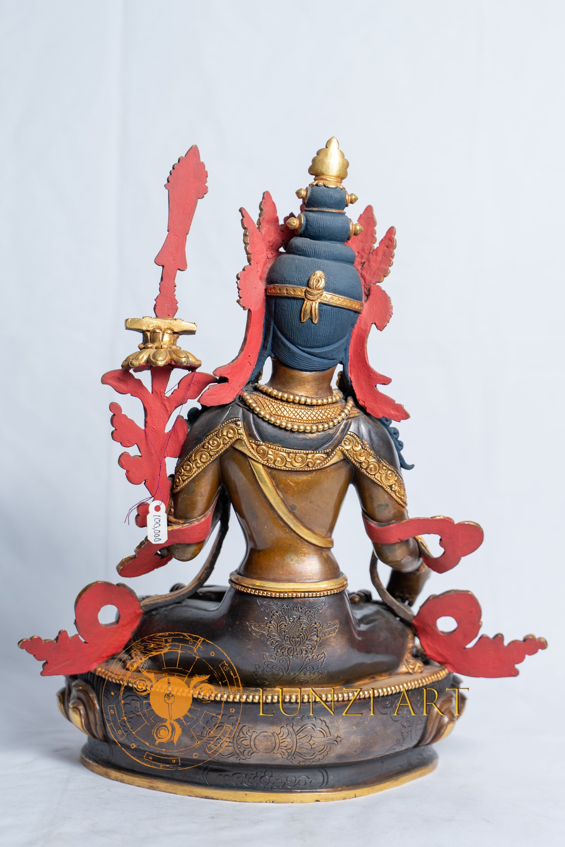 This statue of Manjushri, crafted by artists working with Lunzi Art, depicts the Buddha, which symbolizes Prajna (wisdom). The entire statue is cast in copper and half plated with 24K gold. The statue was cast using the ancient lost wax casting method, and then the intricate patterns were hand-carved and polished.