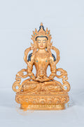 The statue of Aparmita has a calm and compassionate facial expression. Both hands rest gently in his lap in the dhyana mudra, holding a vase, the nectar of immortality and awakening, symbolizing the gift of a long life free from sickness and suffering. It is adorned with an ornate crown inlaid with turquoise and coral, along with finely detailed jewellery and flowing robes that enhance his divine presence. Aparmita is seated in a single-lotus pedestal, embodying infinite compassion, vitality, and spiritual grace.