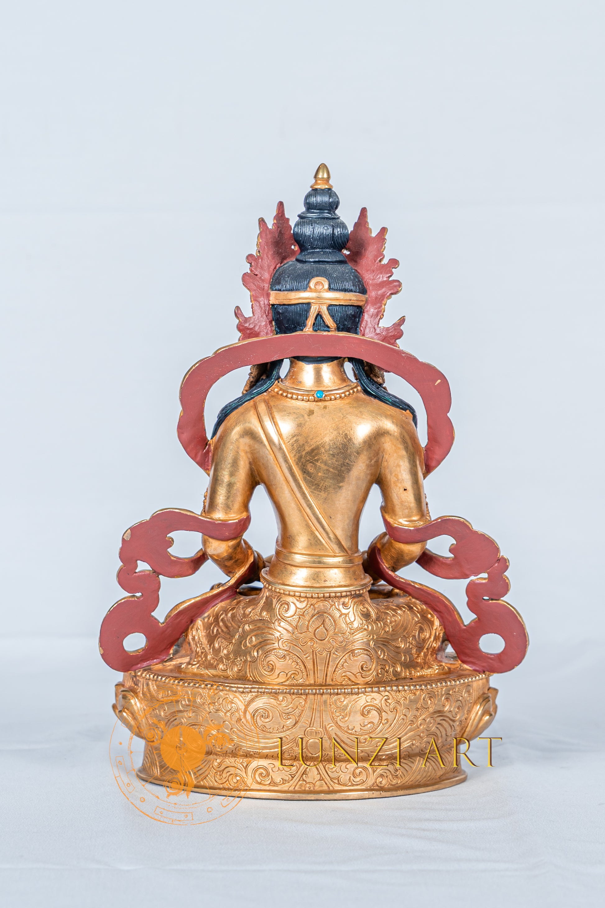 This exquisite statue of the Aparmita is masterfully crafted by skilled artisans associated with Lunzi Art. This statue is made of refined copper using traditional lost wax casting techniques, and fully plated with 24K gold.