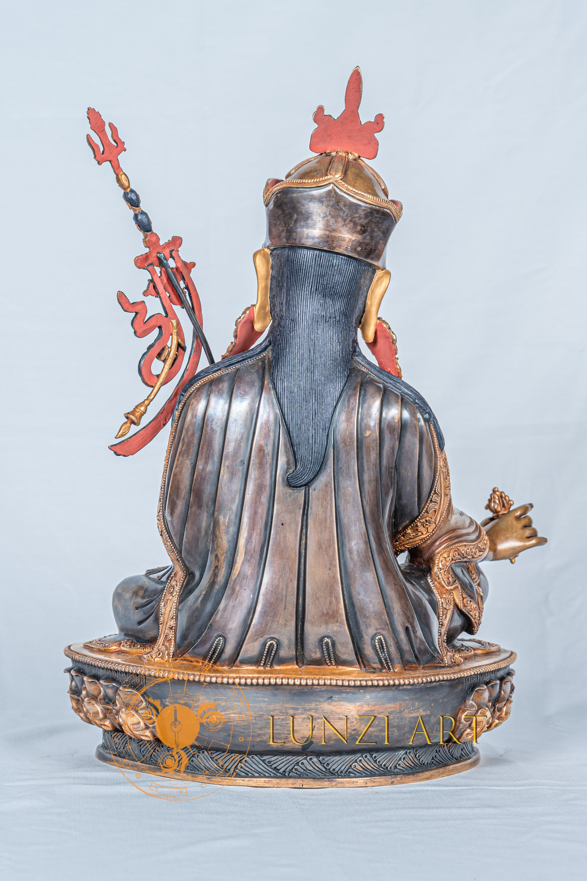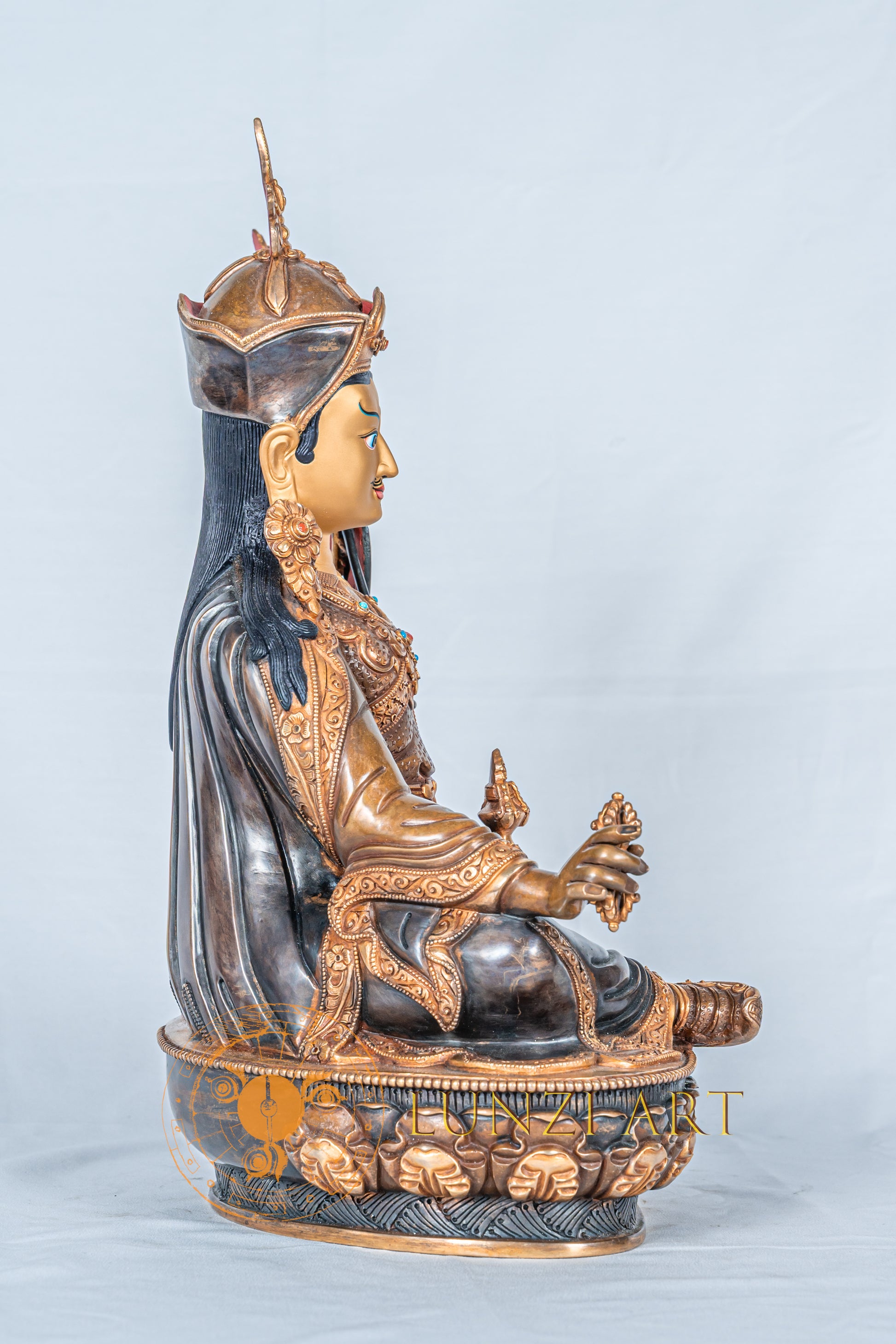 This statue of Guru Rinpoche was meticulously handcrafted by skilled artisans working with Lunzi Art. Made of high-quality copper with partial gold plating, it has been beautifully hand-painted to accentuate the intricate details and the serene, lifelike expression of the master. Crafted using the traditional lost-wax casting method and carefully hand-carved with exceptional precision, this piece embodies both exquisite craftsmanship and profound spiritual significance.