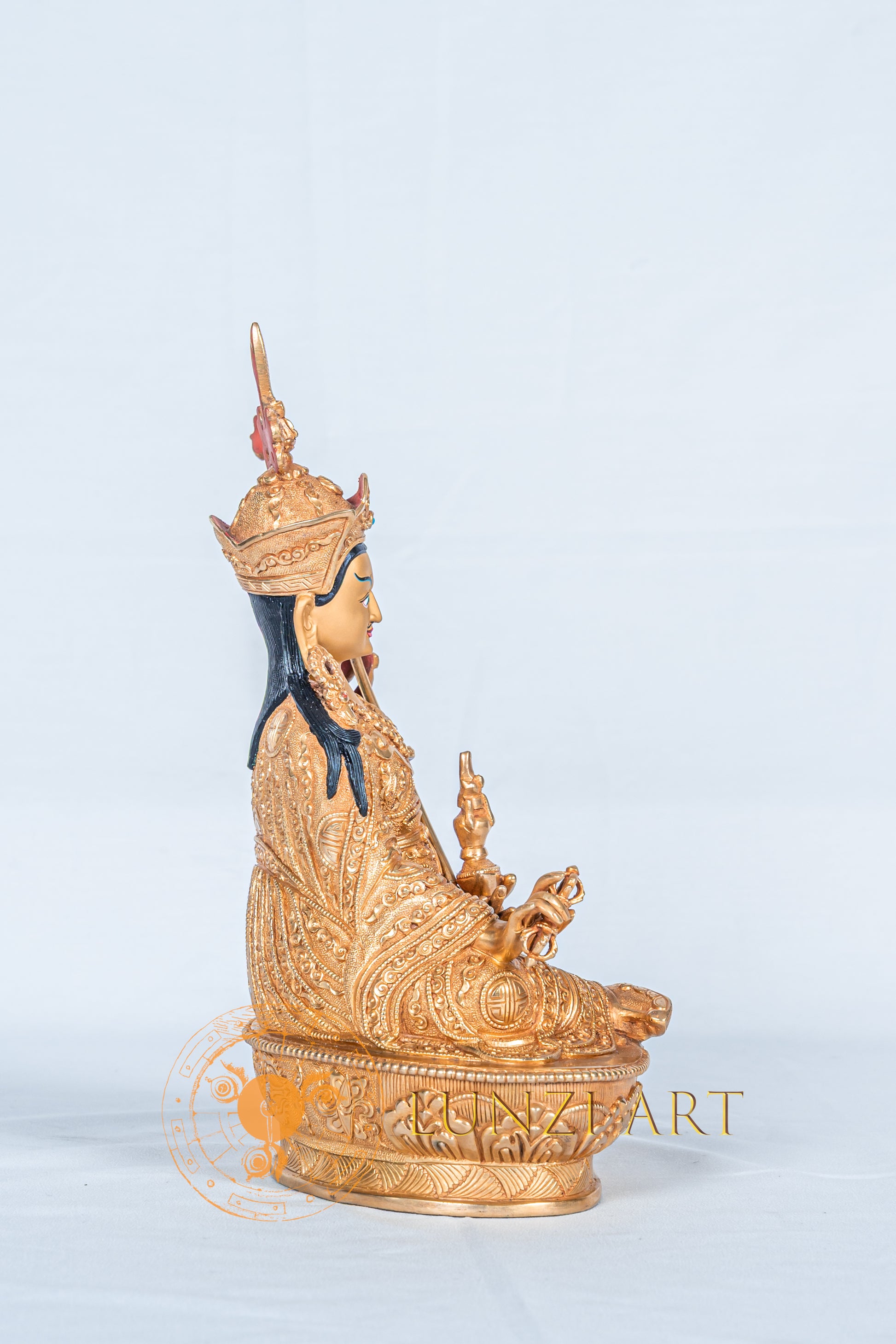 This statue of Guru Rinpoche was meticulously handcrafted by skilled craftsmen working with Lunzi Art. Made of fully gold-plated copper, it has been beautifully hand-painted to highlight the intricate details and lifelike expression of the master. Created using the traditional lost-wax casting method and carefully hand-carved with exceptional precision.