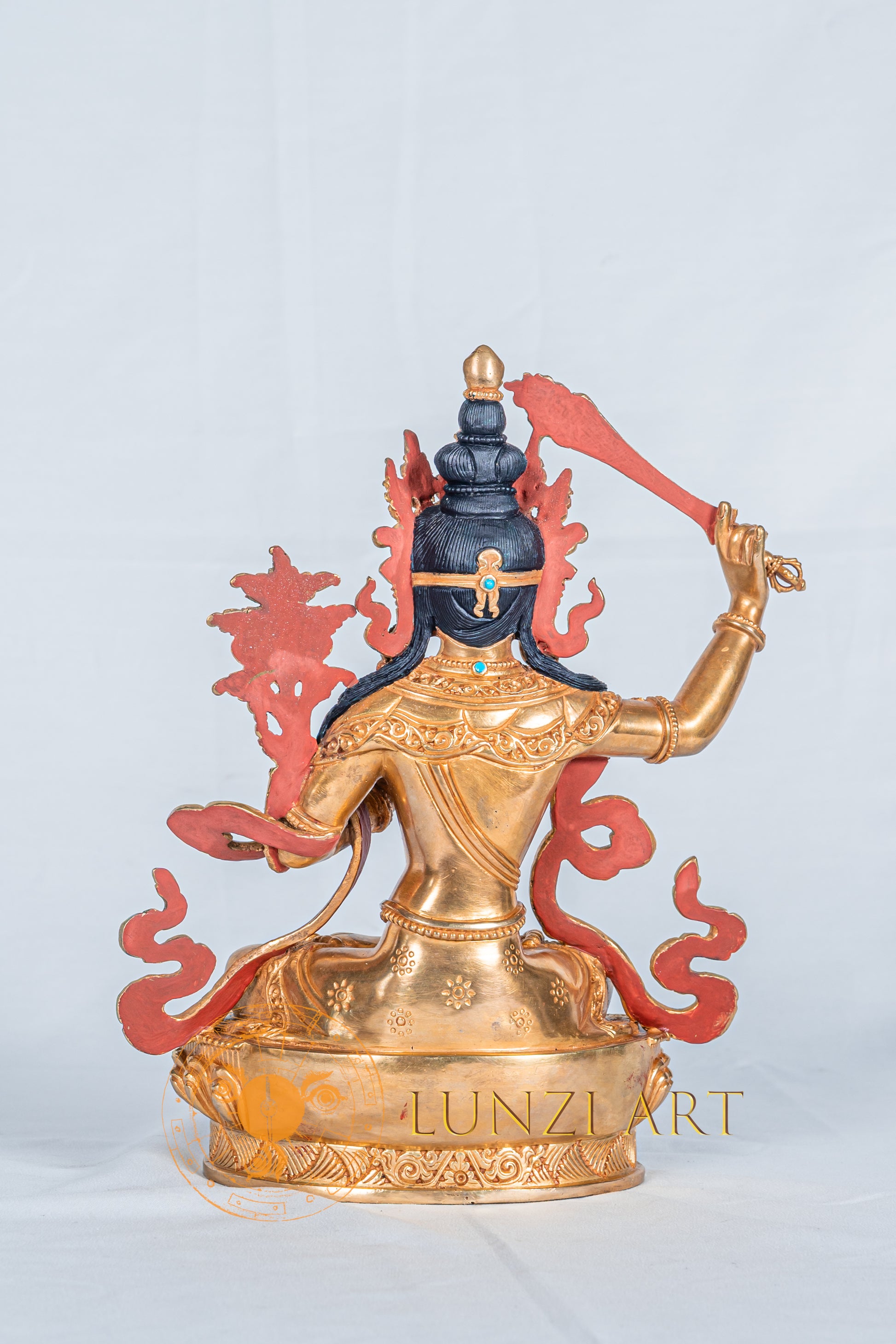 This Manjushri is a magnificent creation handcrafted by the skilled artisans working with Lunzi Art. Meticulously made from high-quality copper and fully gold-plated, the statue radiates divine brilliance and spiritual purity. Every detail, from the serene facial expression to the finely carved ornaments and flowing robes, is carefully hand-carved with intricate precision. The statue is then polished to a radiant finish, enhancing its golden glow and sacred presence.