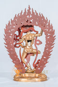 The statue stands in a dynamic, dancing pose on a lotus base. The statue has a wrathful expression with three wides, bulging eyes and bared fangs. It’s hair flows upwards like flames. Its primary right hand holds a curved knife (Kartika) representing the inseparable union of wisdom, while the left hand holds a skull cup (Kapala). The figure is adorned with a skull crown and other ornaments, embodying a wrathful deity in a powerful posture.