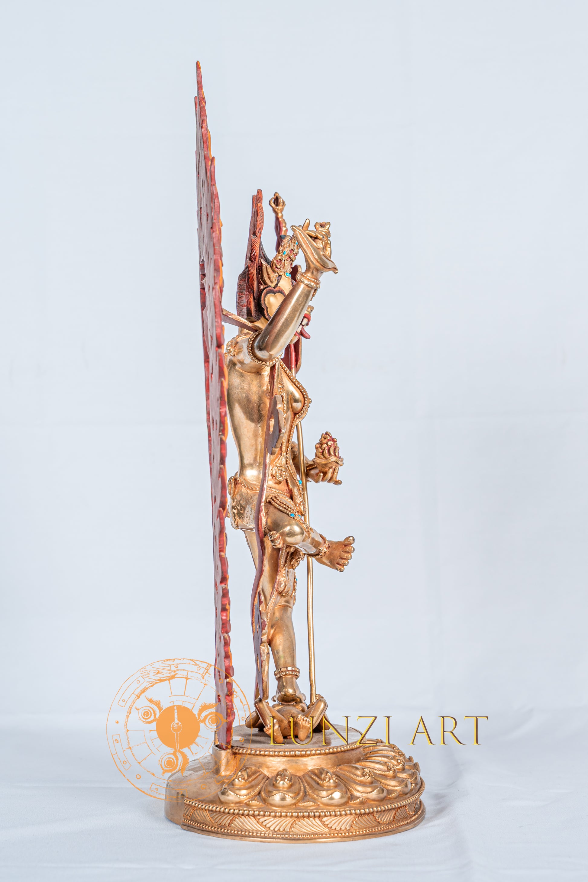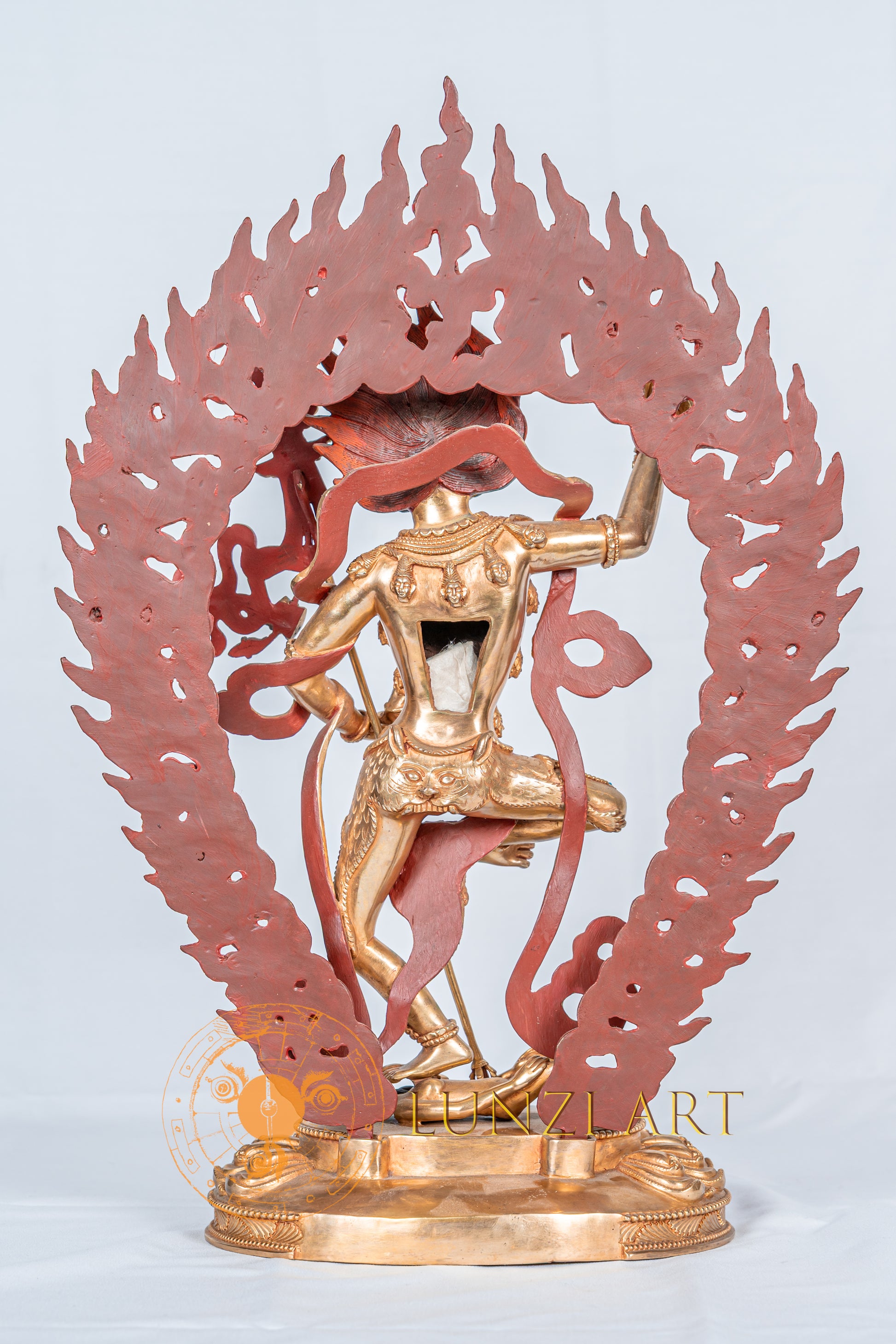 This statue of Simha Mukha, was crafted by artisans working with Lunzi Art, is made of refined copper using the traditional lost-wax method. It is meticulously hand-carved, polished, and plated with 24K gold.