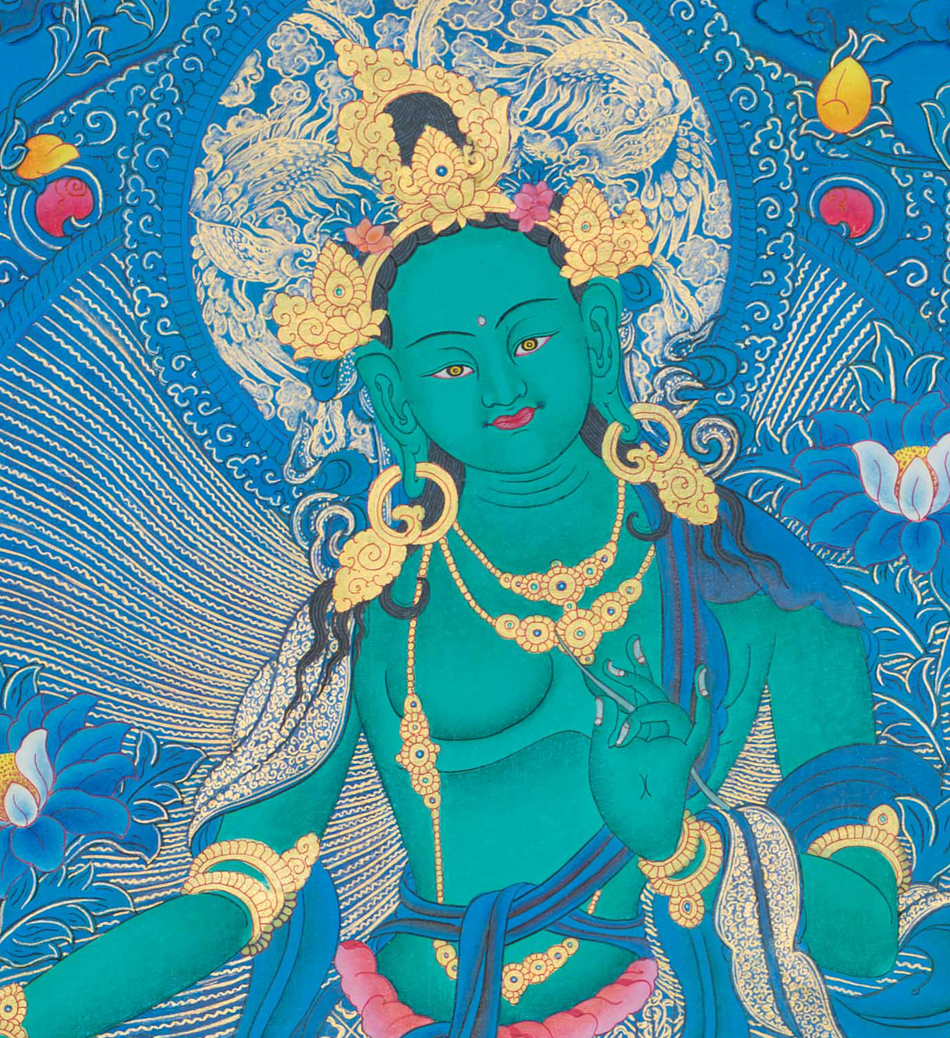 At the center, Green Tara sits in lalitasana posture on a lotus throne symbolizing purity, her right leg extended for swift action and left folded in meditation. Her green complexion, representing vitality and the air element, is adorned with silken scarves, jewel ornaments, and a crown topped by Amitabha Buddha. Her right hand forms the varada mudra of generosity, while her left, in vitarka mudra, holds a blue utpala lotus, symbolizing spiritual potential. Surrounding her are the four directional Taras—white, yellow, red, and green—along with attendant bodhisattvas and Amitabha above, all framed by lotus petals, cloud motifs, and offering goddesses, reflecting her role in protecting against the eight fears as per Atisha’s praises.