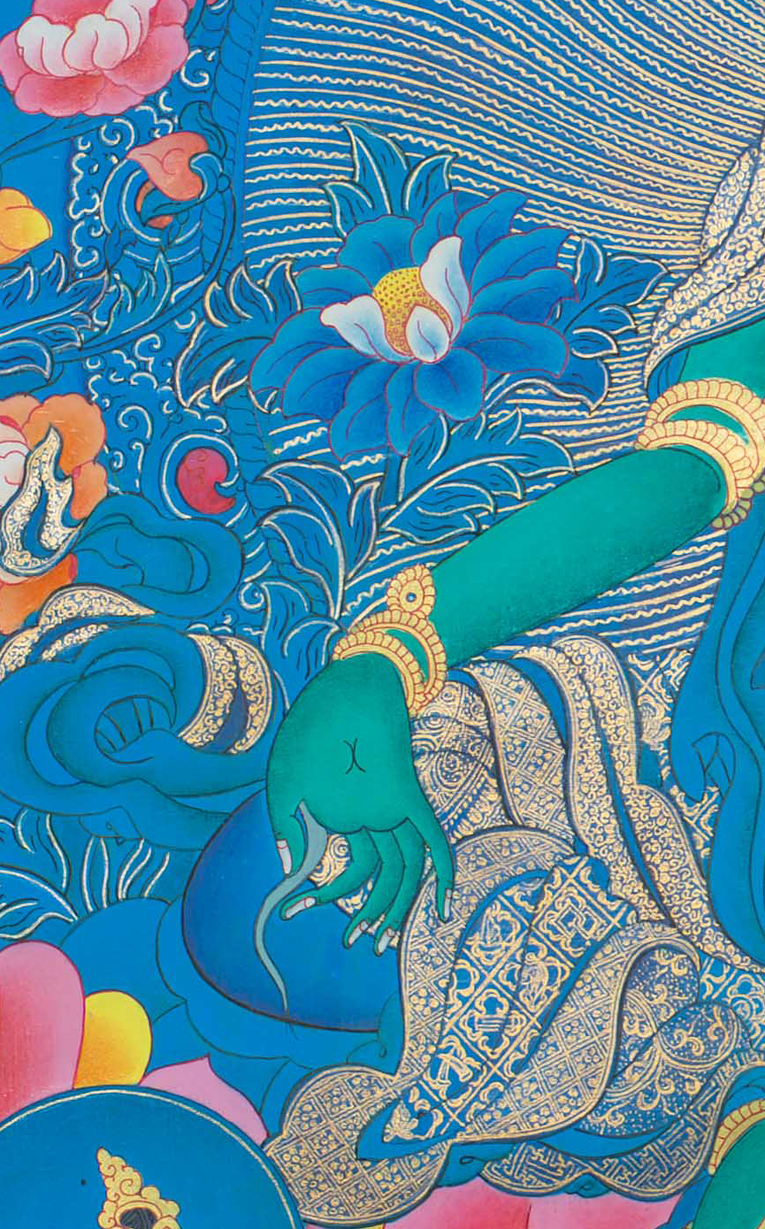 The Green Tara Thangka unveils Arya Tara, the Noble Liberator and Mother of All Buddhas, a dynamic embodiment of enlightened compassion in her vibrant emerald form. This sacred scroll captures her as the swift-savior deity, ready to dispel fears and obstacles, making it a vital piece for Green Tara meditation practice. Crafted using the traditional Himalayan thangka technique on fine cotton canvas, this artwork reflects meticulous artistry honed over decades in Kathmandu Valley. The canvas, meticulously stretched and gessoed with natural binders, ensures durability, while mineral-based pigments in radiant blues, greens, and reds create a luminous glow, with every charcoal-sketched outline and layered stroke honoring ancient Buddhist iconography.