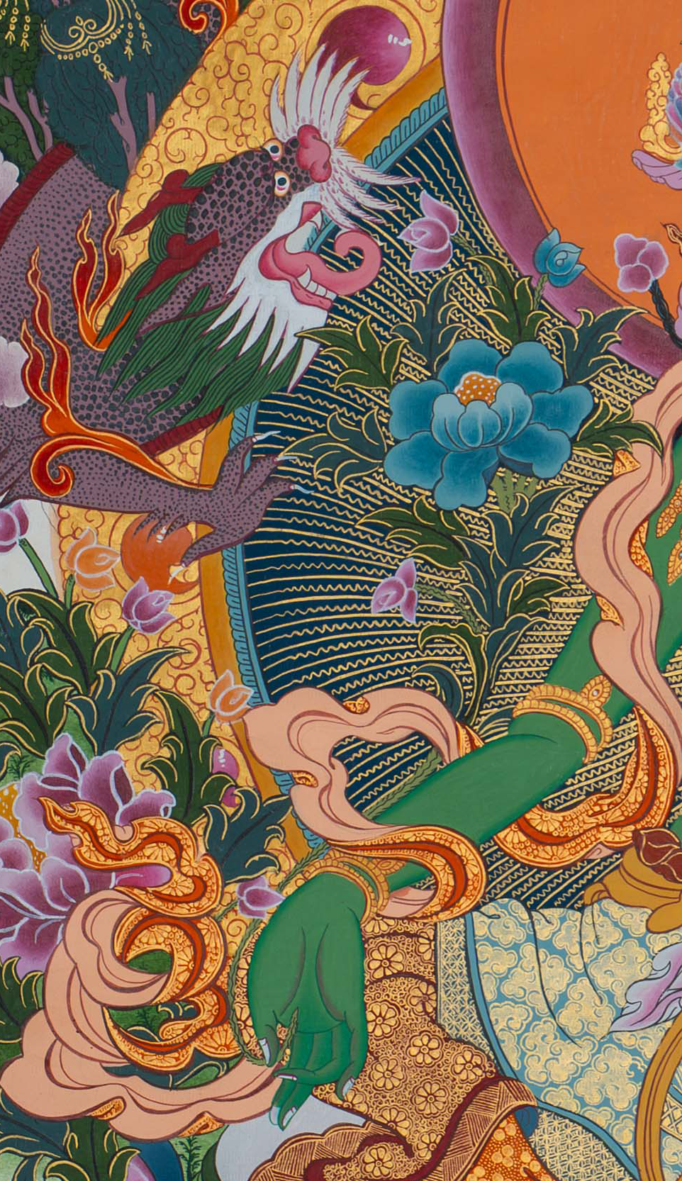 At the center, Green Tara sits in a serene lalitasana posture on a lotus throne symbolizing purity, her right leg extended for swift action and left folded in meditation. Her lush green complexion, embodying vitality and the air element, is adorned with golden ornaments, flowing scarves, and a crown topped by Amitabha Buddha. She holds a blue utpala lotus in her left hand, representing spiritual awakening, while her right hand forms the varada mudra of generosity. Flanked by dragons and vibrant floral motifs, the scene is framed by a golden halo and cloud patterns, with a Dharma wheel and offerings below, symbolizing her protective power against the eight fears as per Atisha’s praises.