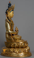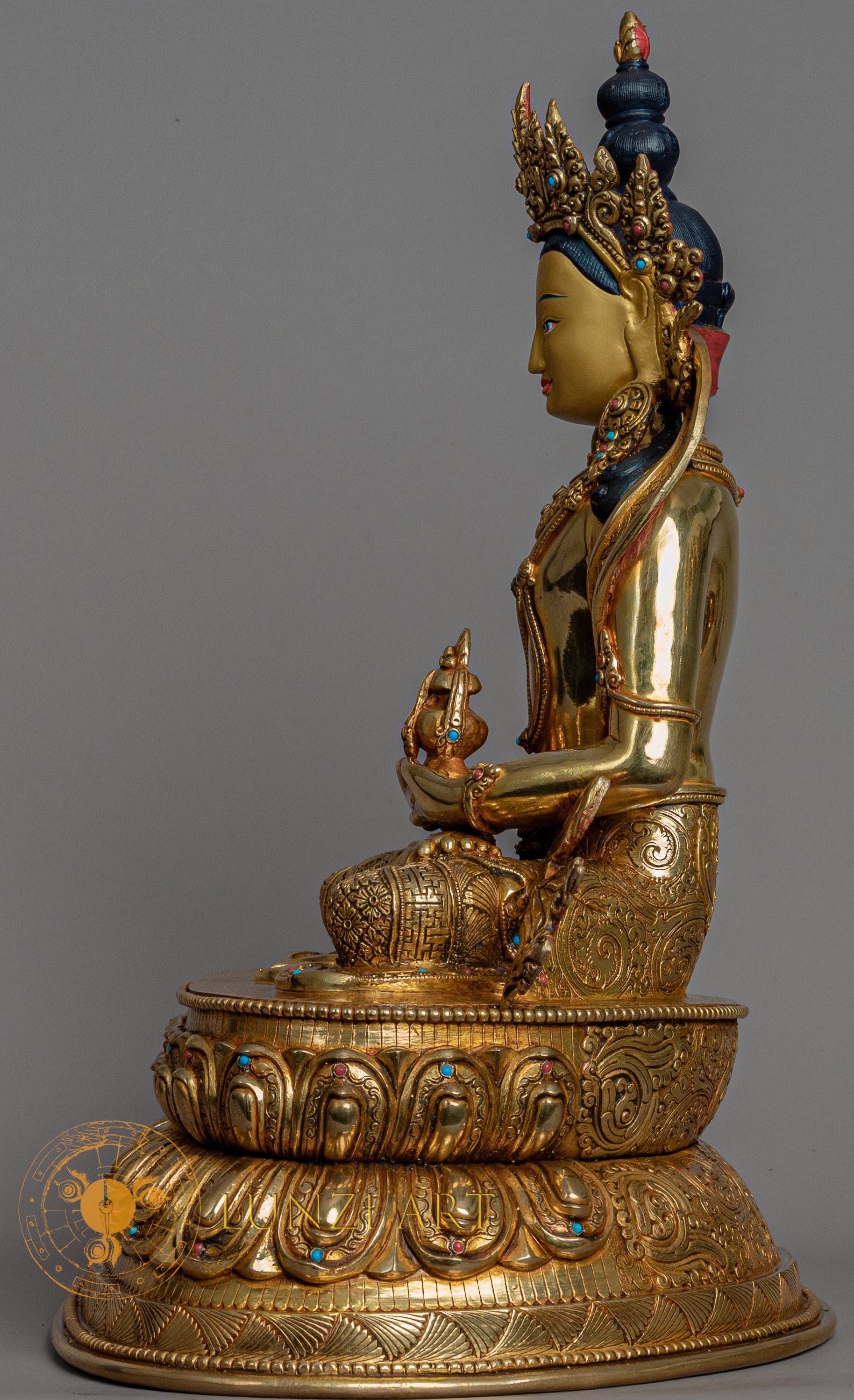 The statue of Aparmita displays a serene and compassionate countenance, symbolizing longevity, wisdom, and boundless compassion. His peaceful facial expression radiates inner calm and spiritual purity. Aparmita’s hands rest gracefully in his lap in the dhyana mudra, the gesture of meditation, holding an amrita kalasha (vase of immortality). He is adorned with an ornate crown inlaid with turquoise and coral, along with elaborate jewelry including earrings, necklaces, armlets, and anklets, all finely detailed to enhance his divine presence. Flowing robes with intricate patterns drape elegantly around his body, emphasizing both grace and sacred refinement. Seated in full lotus posture upon a beautifully crafted double-lotus pedestal, Aparmita embodies serenity, spiritual perfection, and the realization of timeless enlightenment.