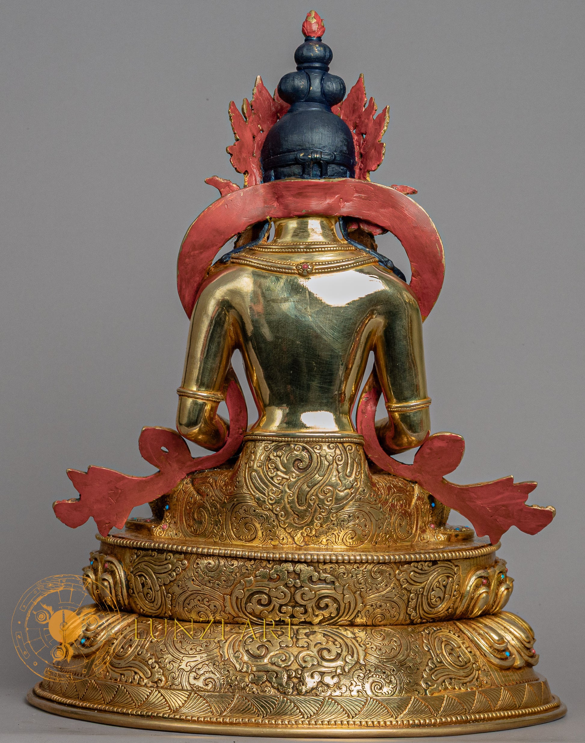 This exquisite statue of Aparmita, the revered Buddhist deity symbolizing longevity, wisdom, and boundless compassion, is masterfully handcrafted by skilled artisans working with Lunzi Art. Made of high-quality copper and fully gold-plated, this statue reflects the timeless beauty of traditional Nepalese craftsmanship. Created using the ancient lost-wax casting method, every detail embodies devotion, precision, and spiritual elegance, making it a perfect centerpiece for meditation or sacred spaces.