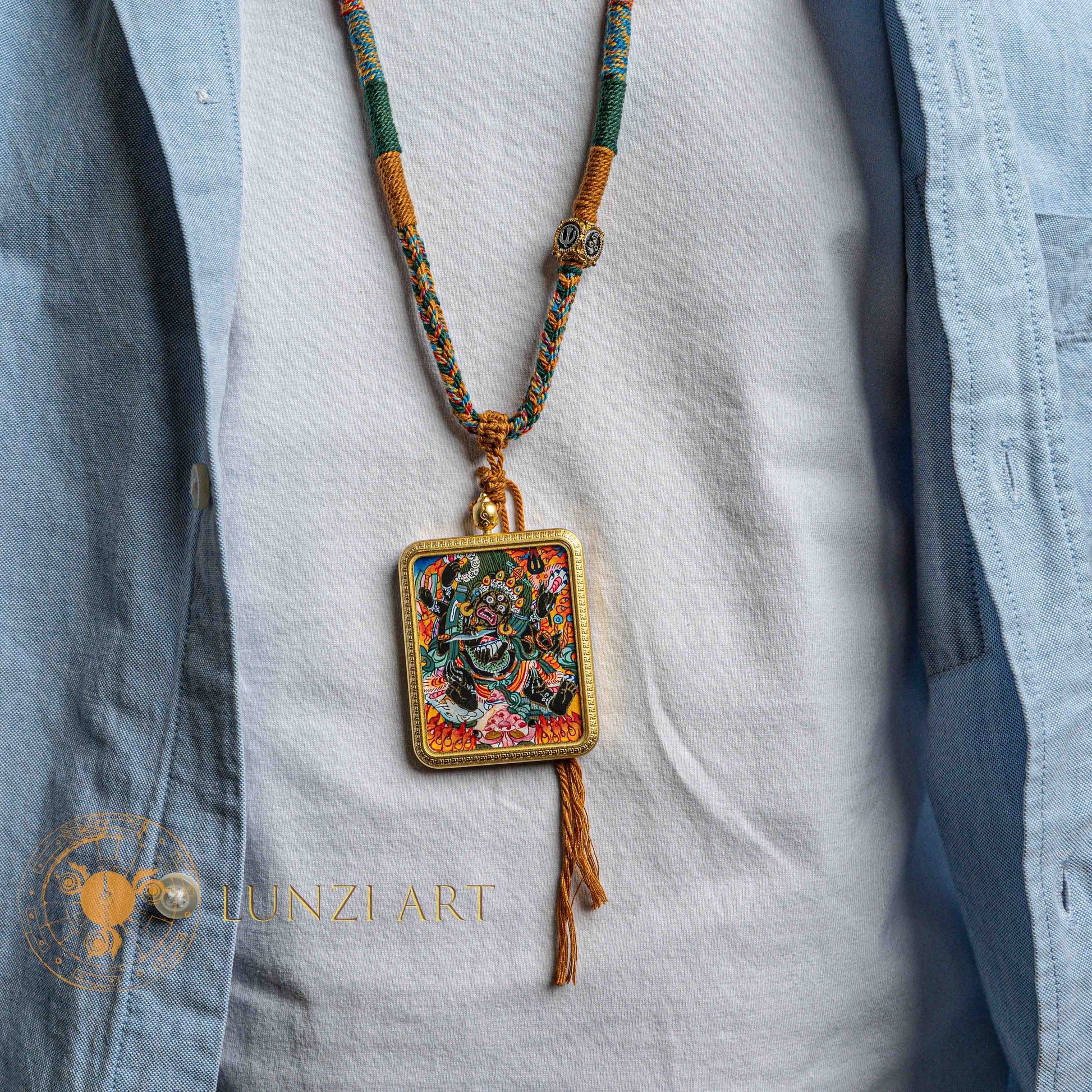A midnight-blue apocalypse erupts within the golden frame: Six-Armed Mahakala, the Supreme Protector of the Dharma, explodes forth in a storm of scarlet and emerald wisdom-fire. His three blazing eyes stare through every realm, fangs bared in ferocious compassion, six powerful arms brandishing curved knife, skull-cup of fresh blood, trident, sword, damaru drum, and noose while he tramples the corpse of ego beneath his feet. Serpents writhe through his wild green hair, flames crown his five-skull diadem, and a garland of fifty dripping heads swings in ecstatic fury. Hand-painted with searing natural mineral pigments by the highest tantric masters of the Nepali Himalayas and sealed forever in a lavish 24k gold-plated titanium steel frame with intricate filigree, this miniature gau pendant hangs from the traditional five-color sacred cord, the fiercest guardian deity ever worn heartbeat-close.