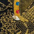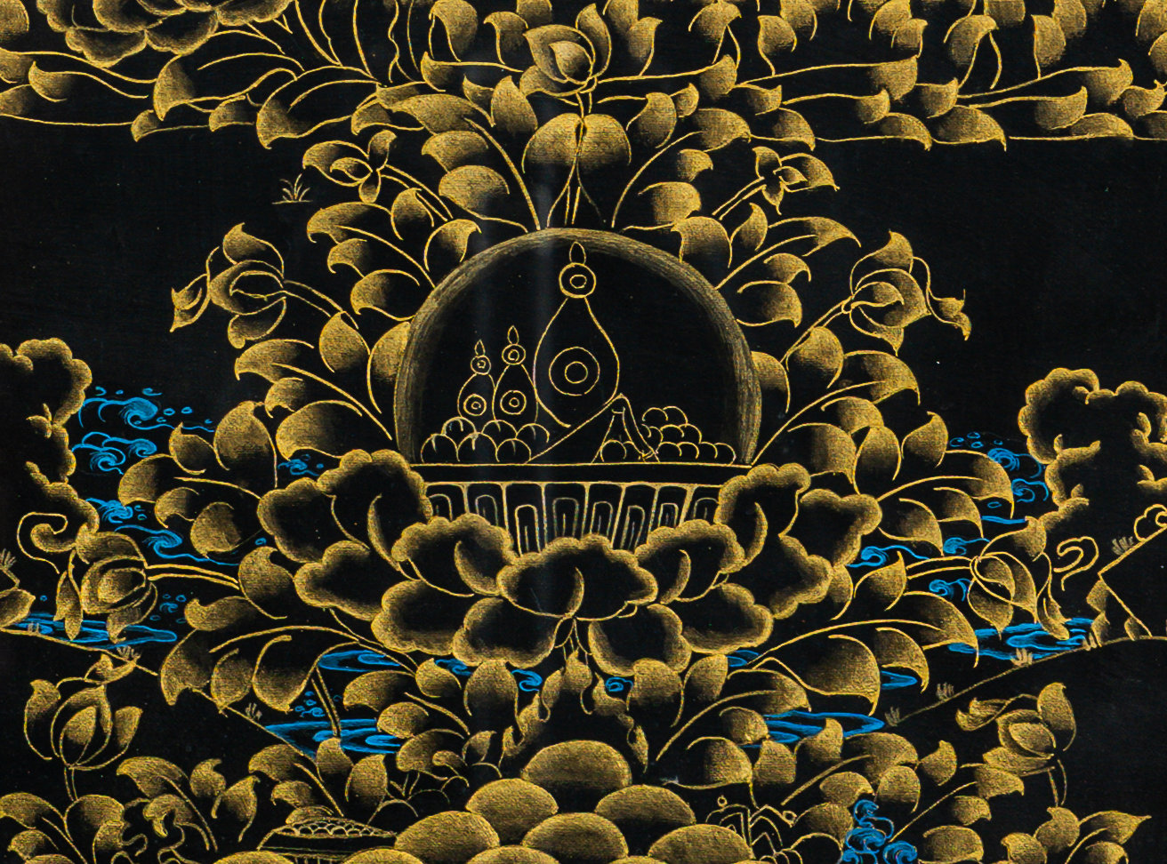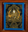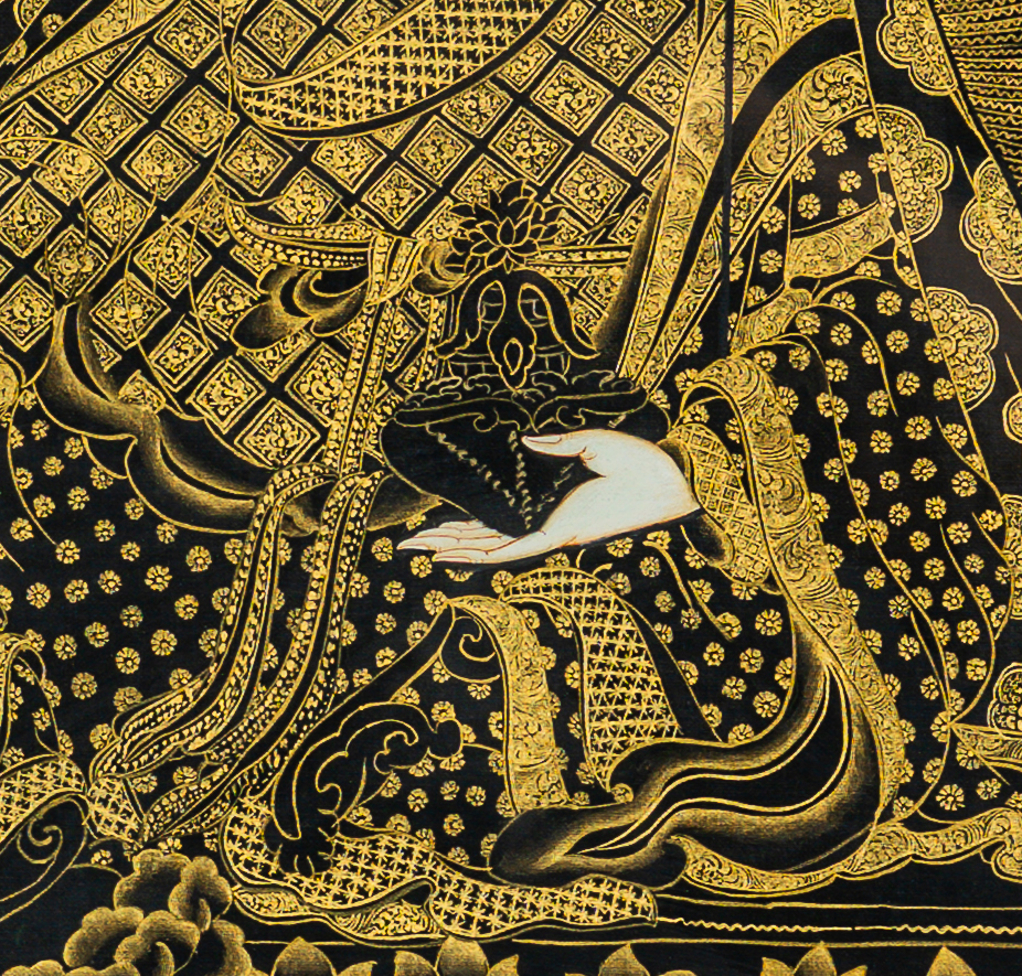 Crafted in the prestigious Nagpa style, this artwork features a deep, obsidian background that makes the intricate gold work radiate with divine energy. The artist has meticulously rendered every detail, from the complex "chainmail" patterns of his royal robes to the shimmering rays of his halo and the fine textures of the surrounding clouds. This heavy application of gold creates a luminous, three-dimensional effect that changes beautifully with the light. This Thangka is not just a painting but a powerful energetic support for meditation, perfect for those seeking the transformative protection of the Great Master.
