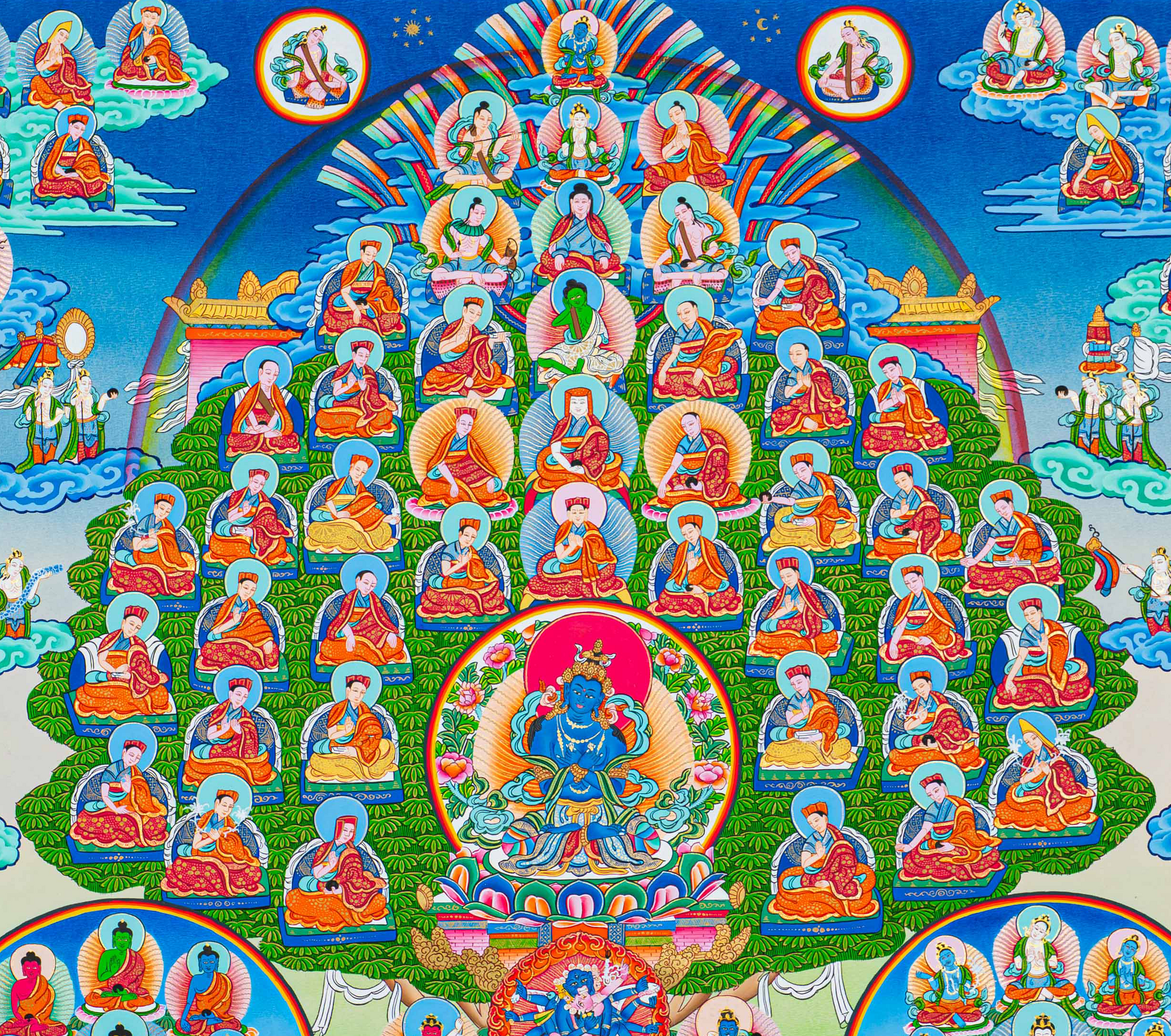 At the heart of the tree sits the deep blue Vajradhara, symbolizing the union of wisdom and compassion, surrounded by a tiered assembly of enlightened masters, Yidams, and Dakinis. The intricate composition captures a vast hierarchy of wisdom, from the serene lineage lamas above to the fierce, flame-shrouded Dharmapalas at the base who protect the Dharma. Every detail from the delicate lotus blossoms to the shimmering golden halos is created with devotional precision, illustrating the sacred interconnectedness of all beings on the path to liberation.