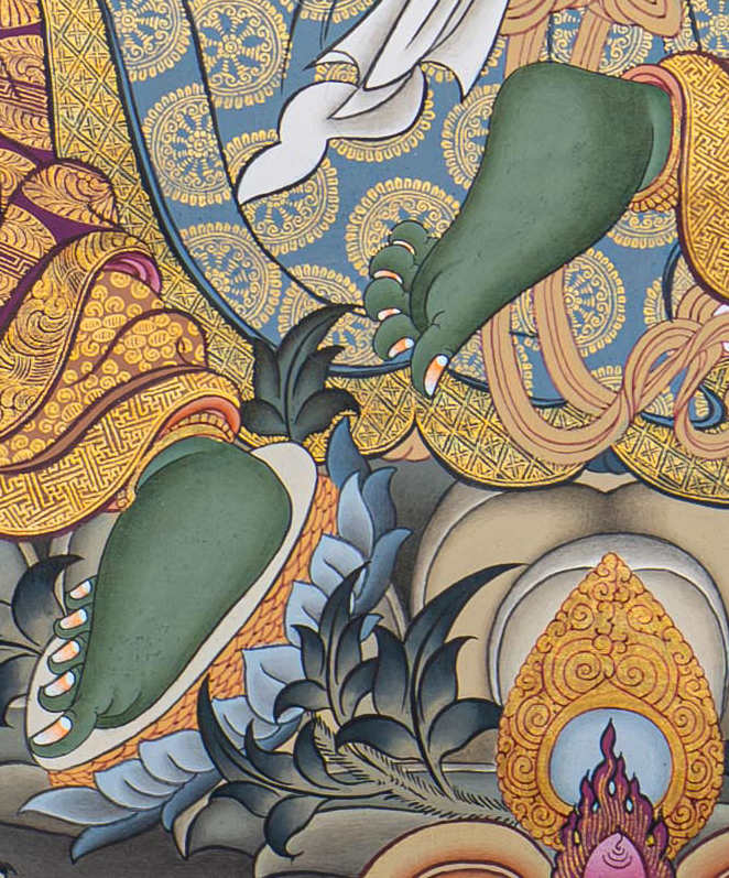 Painted on cotton canvas using traditional methods, this Thangka features actual 24K gold along with different contrasting colors of pink, gray, orange, purple, blue and white. These colors in Thangkas work as a visual language, conveying profound spiritual truths. At the center is Green Tara, embodiment of enlightened compassion, seated in a royal ease position with the right foot resting on a lotus flower and her left leg is tucked in. Her right hand is extended in the granting gesture, symbolizing her ability to grant wishes and give aid. Her left hand is raised to her chest in the teaching gesture, symbolizing the communication of enlightened knowledge. Both hands can be seen holding the stem of a blue lotus (Utpala) flower. The two lotus flowers symbolize purity and enlightenment.