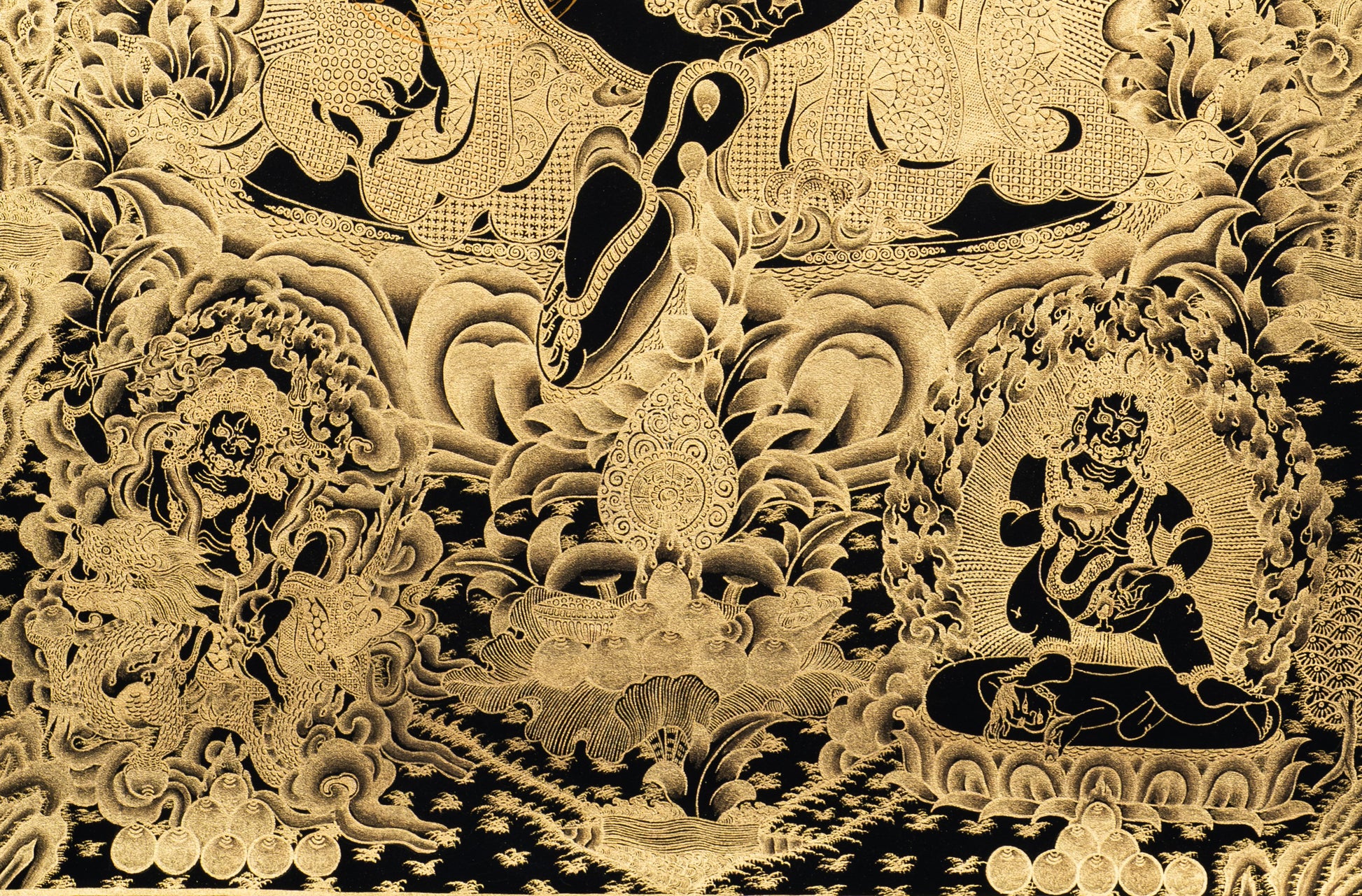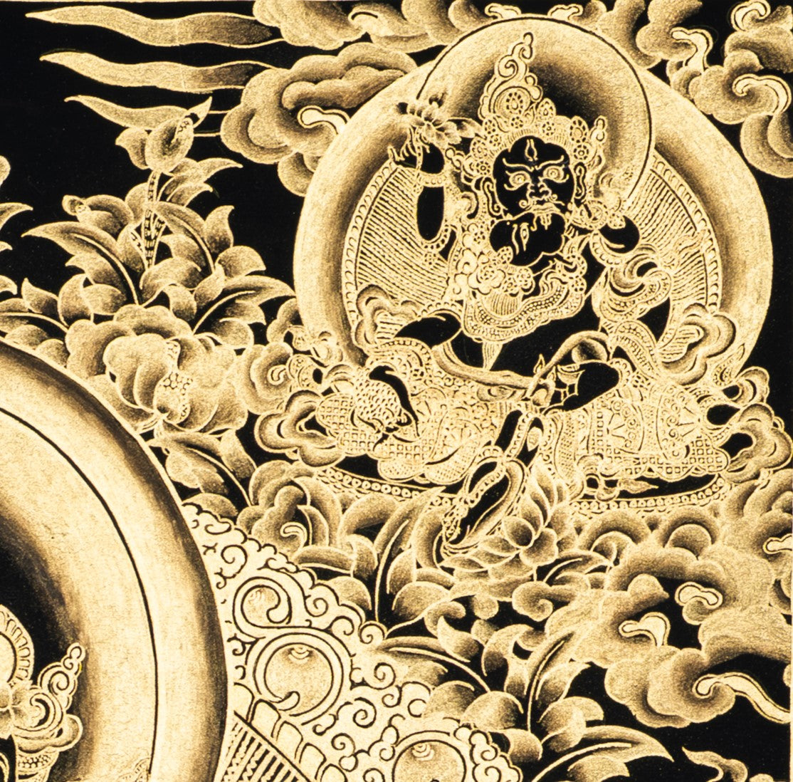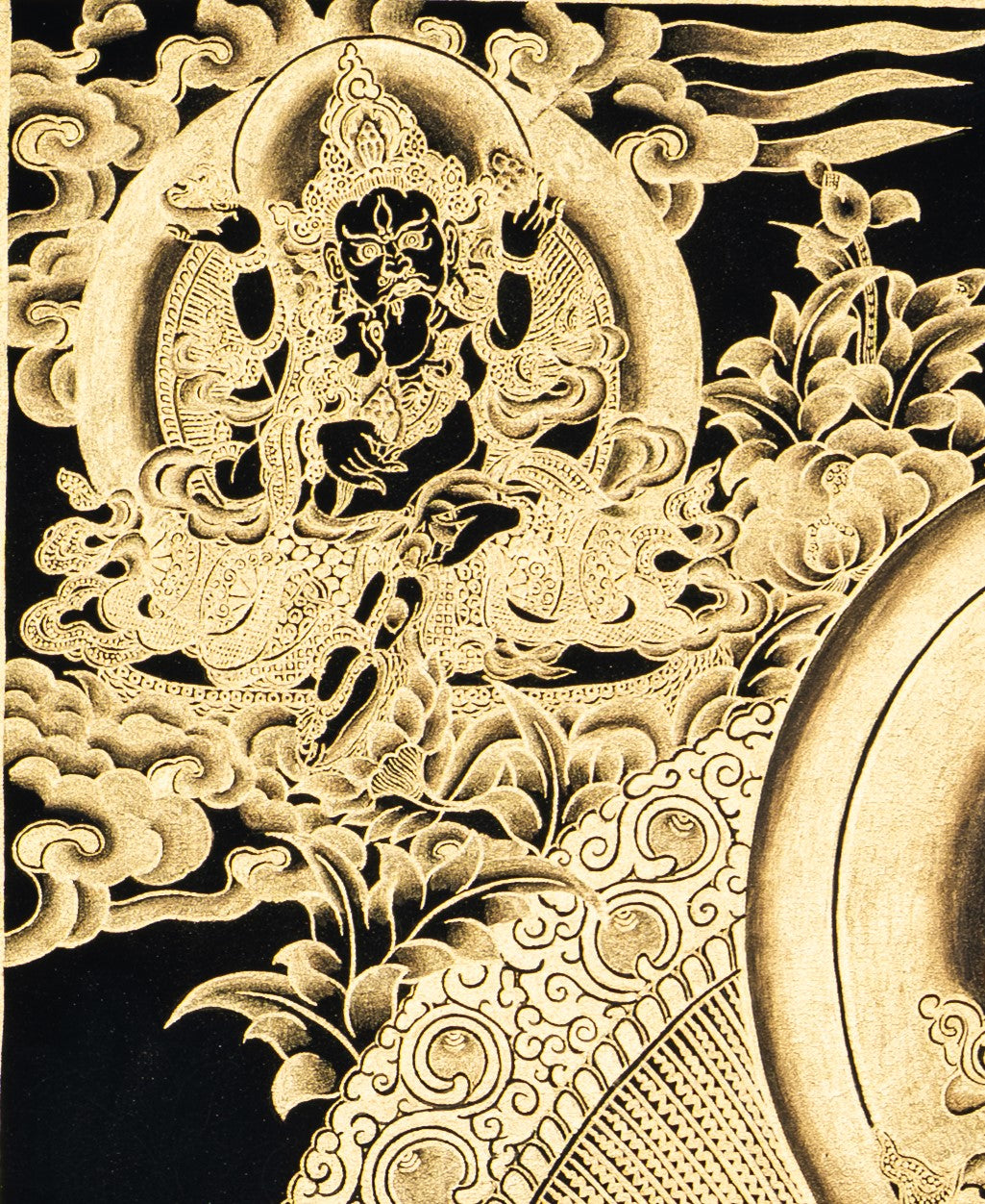 Painted on cotton canvas using traditional methods, this Thangka features deep black and shiny gold colors, offering a soothing and holy atmosphere. At the center is Yellow Jambhala, the deity of fortune and wealth, seated in a lotus position in a relaxed posture. His right leg is extended while his left leg is bent and drawn inwards. His right hand holds a mongoose (Neul) spitting out precious jewels, representing the constant outpouring of wealth and prosperity. His left hand holds a Jambhara fruit, symbolizing fulfillment and abundance. His calm and powerful appearance shows generosity and authority.