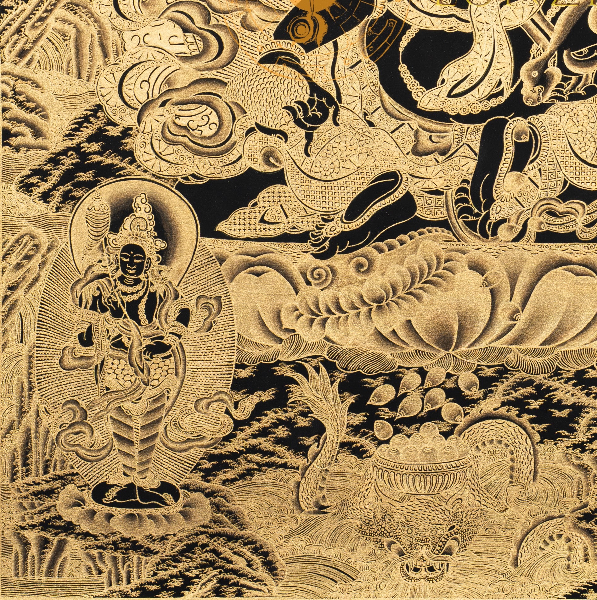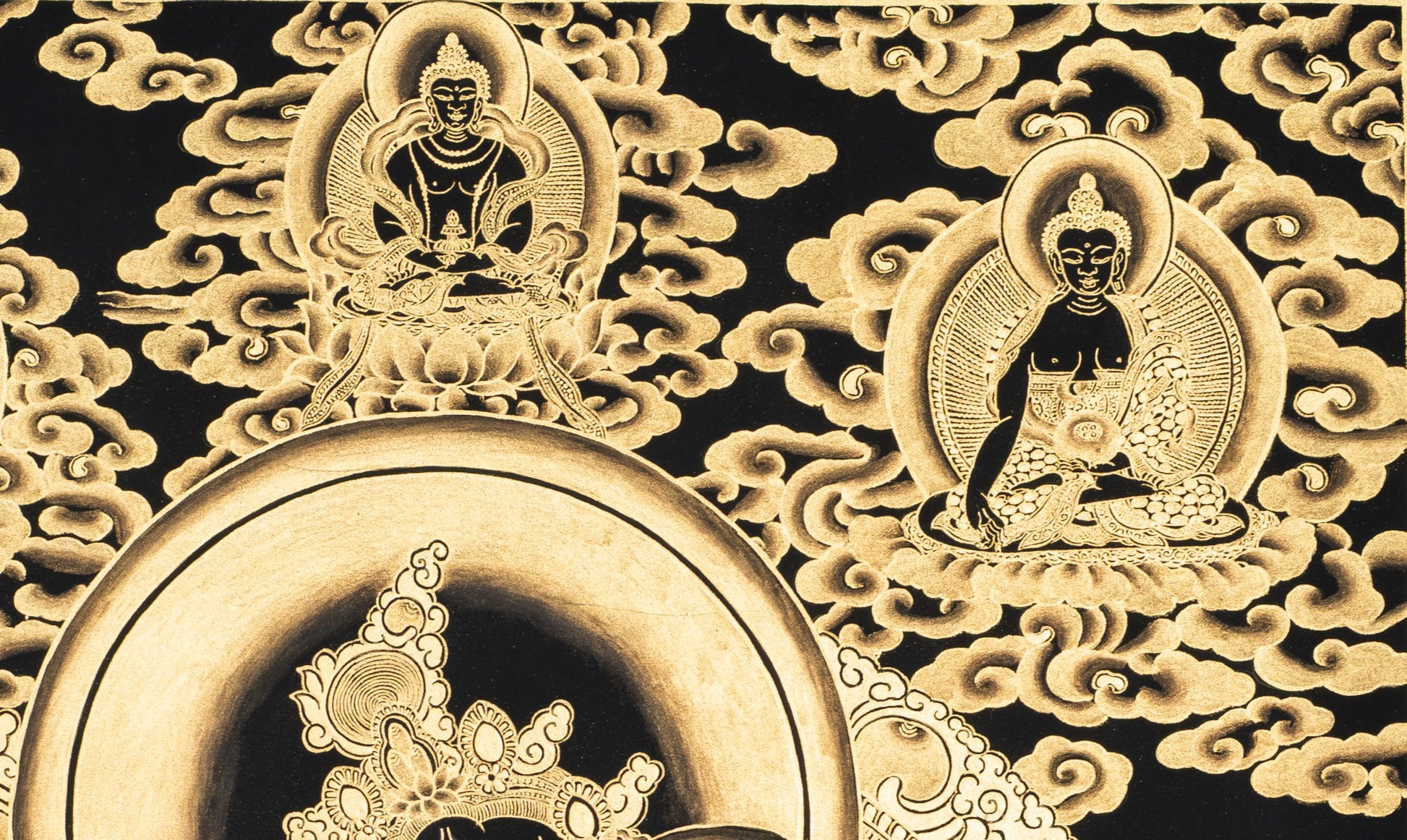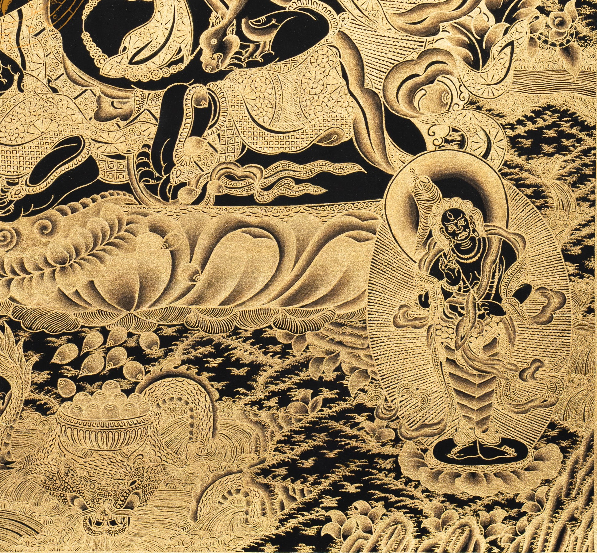 Painted on cotton canvas using traditional methods, this Thangka features deep black and shiny gold colors, offering a soothing and holy atmosphere. At the center is Yellow Jambhala, the deity of fortune and wealth, seated in a lotus position in a relaxed posture. His right leg is extended while his left leg is bent and drawn inwards. His right hand holds a mongoose (Neul) spitting out precious jewels, representing the constant outpouring of wealth and prosperity. His left hand holds a Jambhara fruit, symbolizing fulfillment and abundance. His calm and powerful appearance shows generosity and authority.